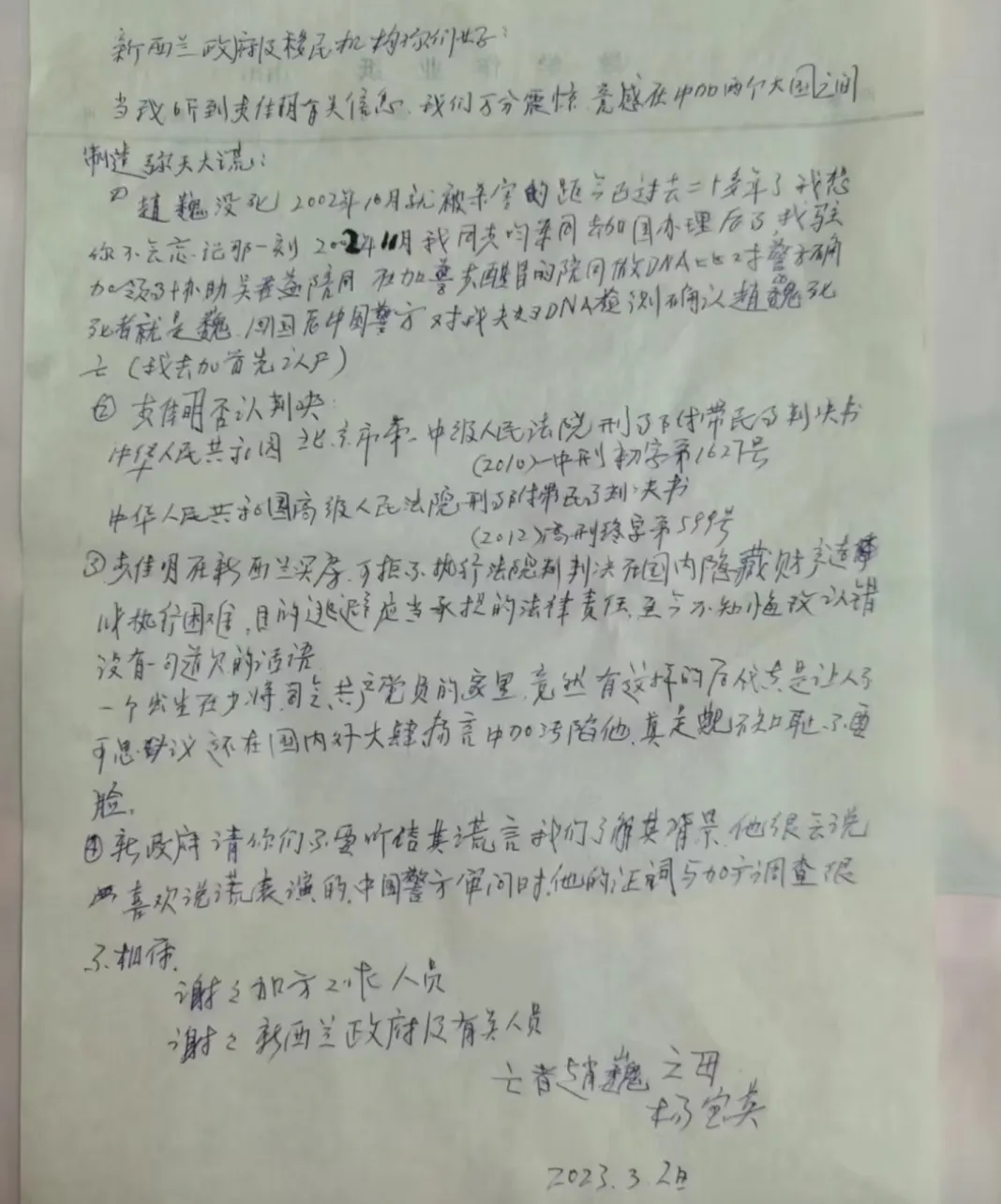 赵巍母亲致新西兰移民局的手写控诉书