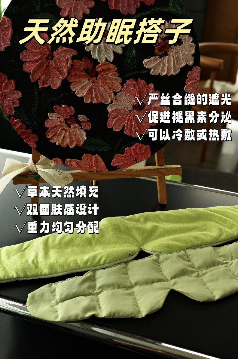 【草本重力眼罩】有植物草本天然材料形成眼周凸点,科学均匀分配重力,能按摩眼周穴位。而且有黄金比例弧线设计,可以全遮光助眠,全黑体验有种特别的安心感,一场好睡眠将悄然降临。