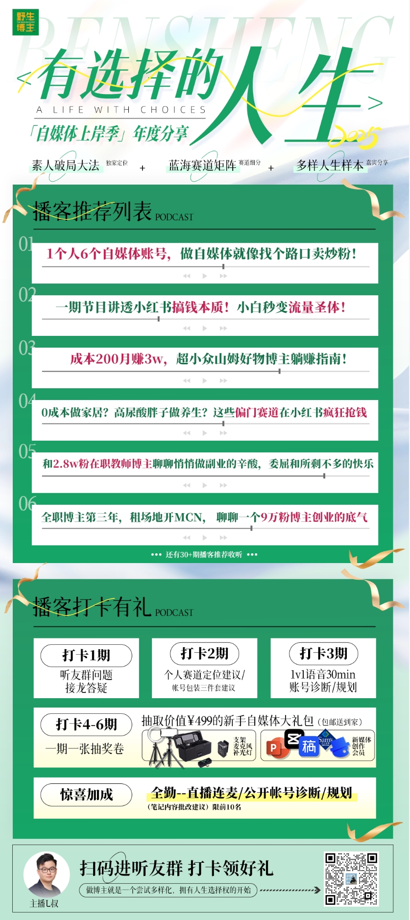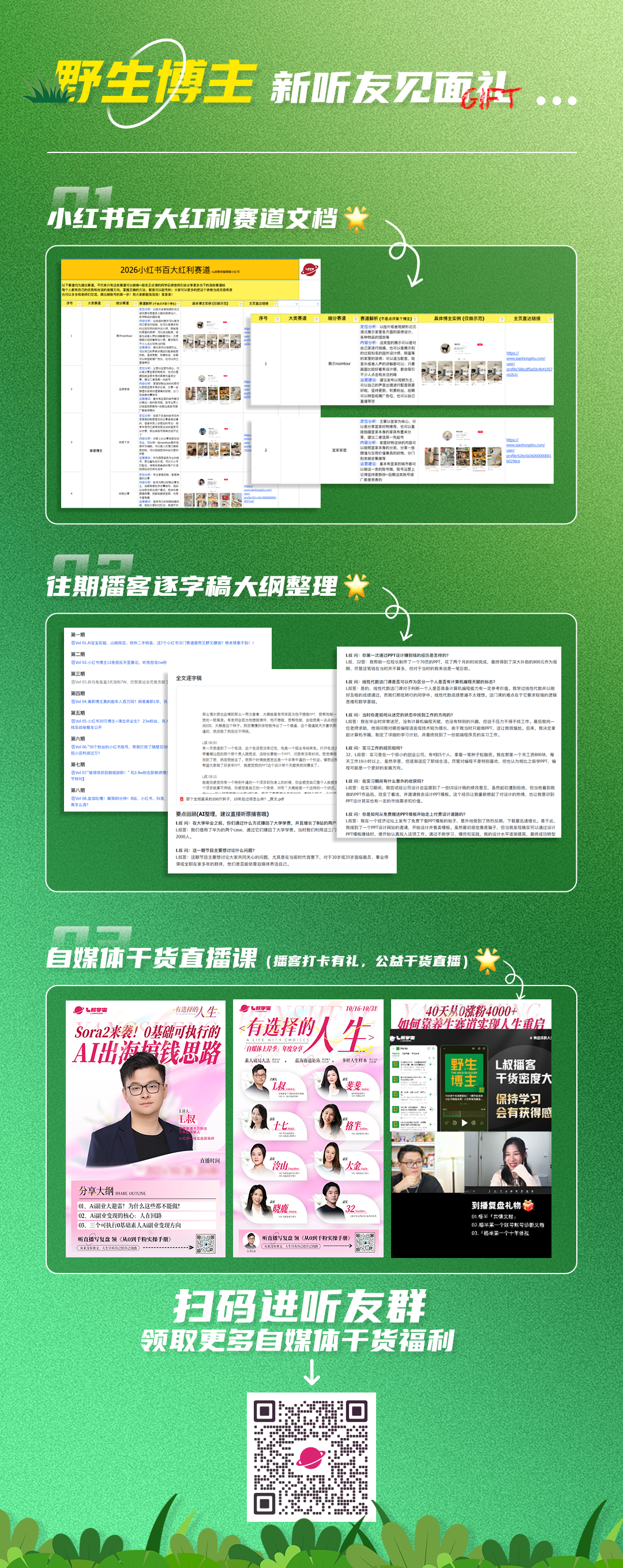 欢迎大家直接扫码进入听友群,获取更多做博主的干货,进群可直接领取《小红书平台活跃用户画像趋势报告》,以及每周我们为大家做免费的自媒体干货直播课,我们在听友群等你