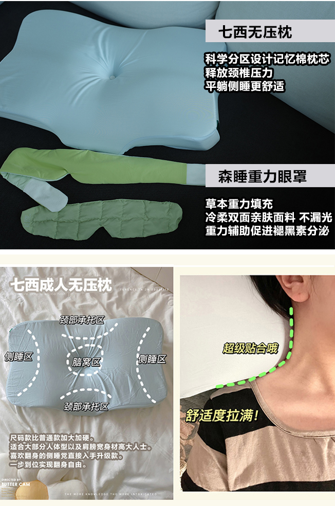 护颈助眠的「七西枕头」不仅可以有效缓解颈椎疲劳,快速帮助进入深睡眠状态;还根据人体工学设计,更适合颈椎生理曲线,不会让你睡醒肩颈酸痛,落枕,实现翻身自由,独特的分码设计可以根据人体的身高体重,头围肩宽选择适合自己的睡眠枕,平时睡不好,肩颈不好的可以去了解看看。