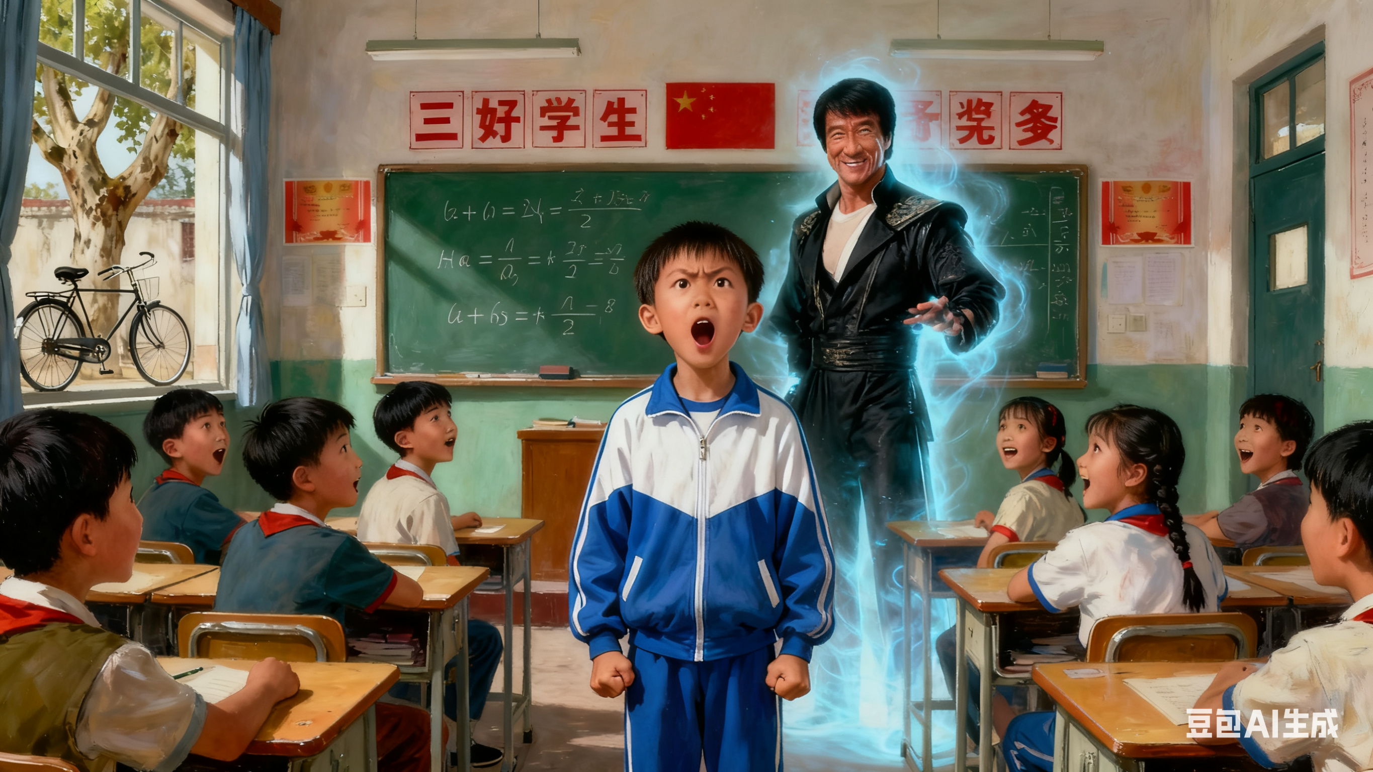 少年时期的孙郁被老师罚站,在教室里高声唱歌呼唤成龙(AI生成)