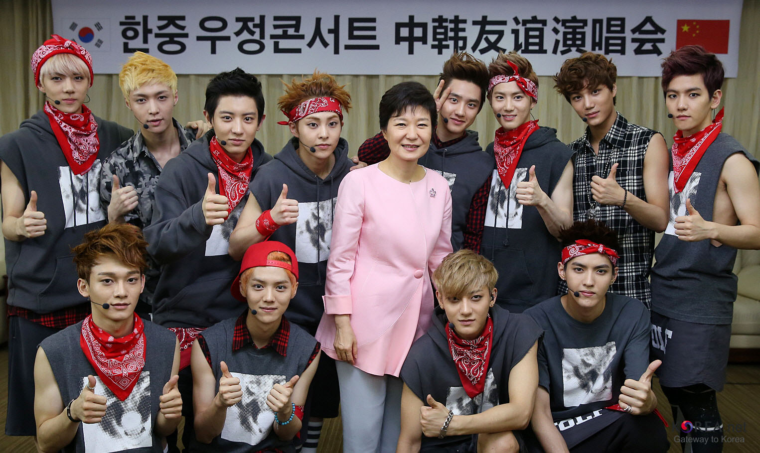</figure>2013年6月28日,韩国总统朴槿惠对华进行国事访问,在中韩友谊演唱会上与EXO成员们合影留念(图片来源:해외문화홍보원 )