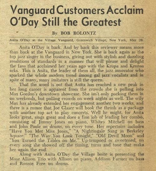 </figure>1958年5月26日,Billboard上关于在Village Vanguard演出的Anita O'Day的文章。不过可惜的是Anita O'Day并没有留下任何在Village Vanguard演唱的现场录音。