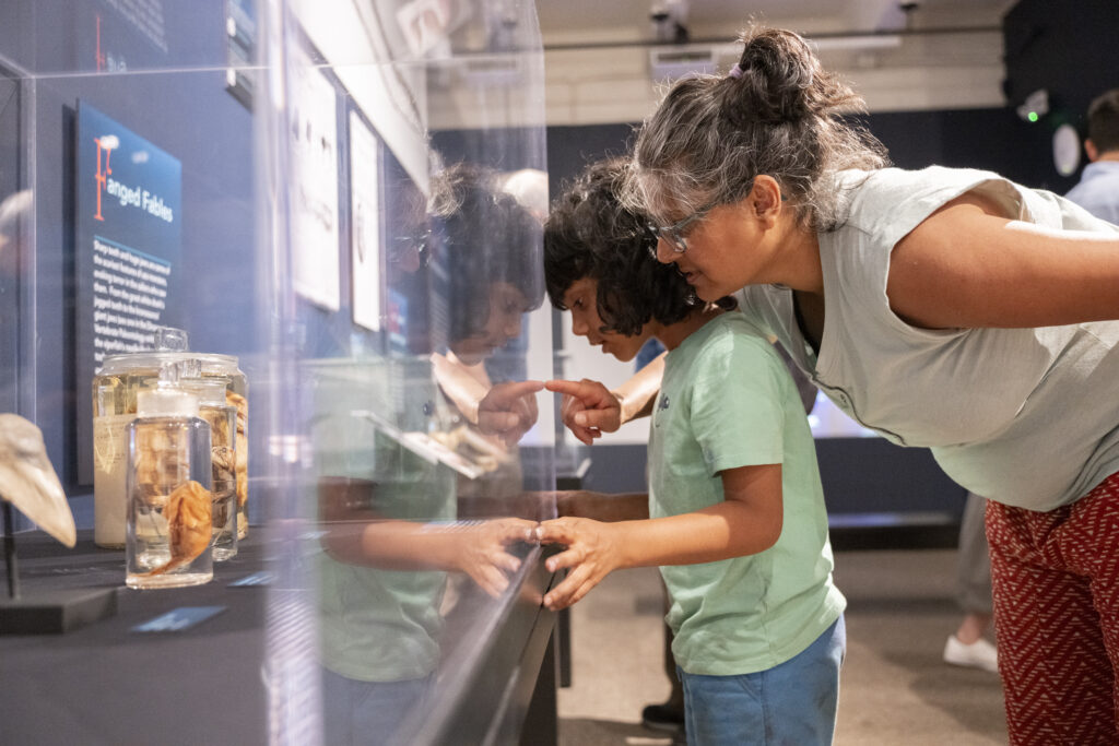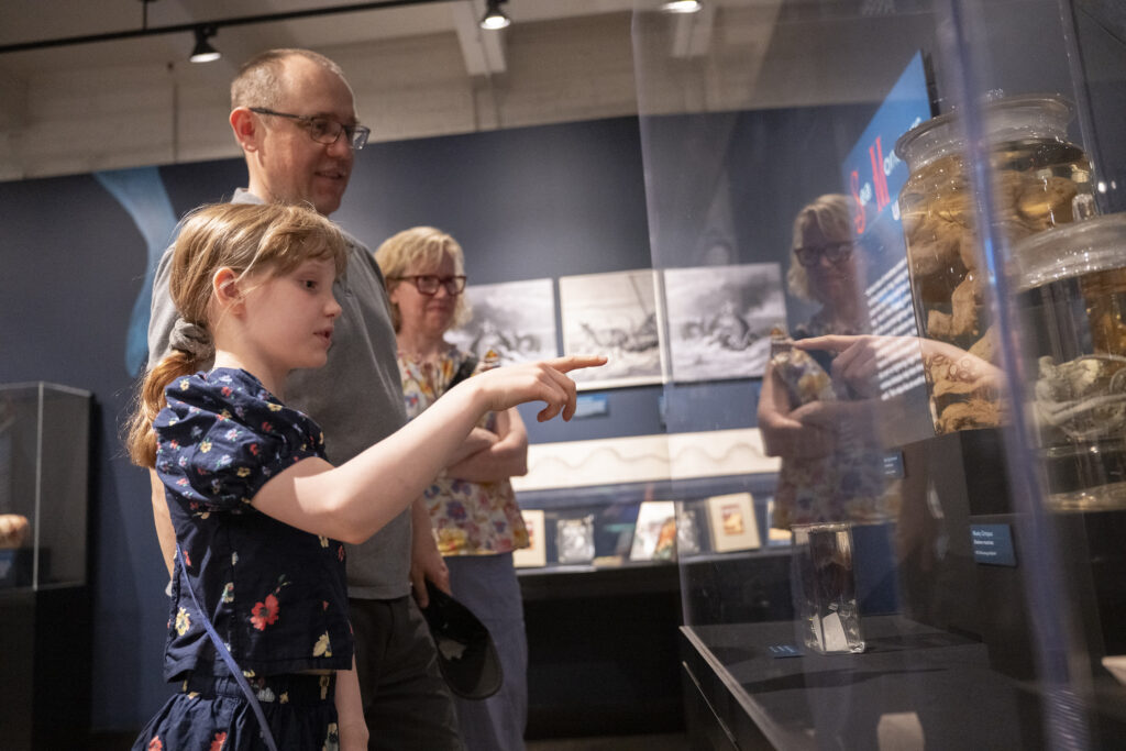 <figcaption class="wp-element-caption">A child points to a display at the “Sea Monsters: Wonders of Nature and Imagination” exhibit at Harvard University’s Museum of Natural History.Courtesy of Tony Rinaldo</figcaption></figure><figure class="wp-block-image size-large">