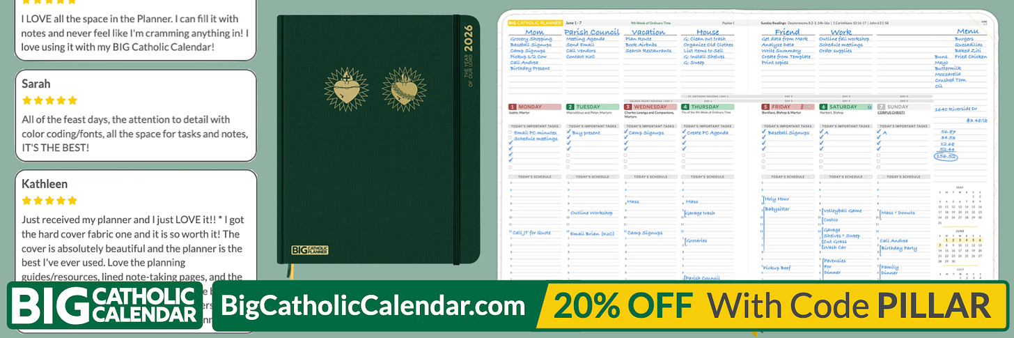 You shouldn’t have to pick between getting things done and living a full Catholic life. With The BIG Catholic Planner and Calendar, you don’t have to. Its 3-phase planning funnel helps you identify responsibilities and get tasks done, all through the lens of the life of the Church. Pillar readers get 20% off with code PILLAR at BigCatholicCalendar.com for a limited time.
