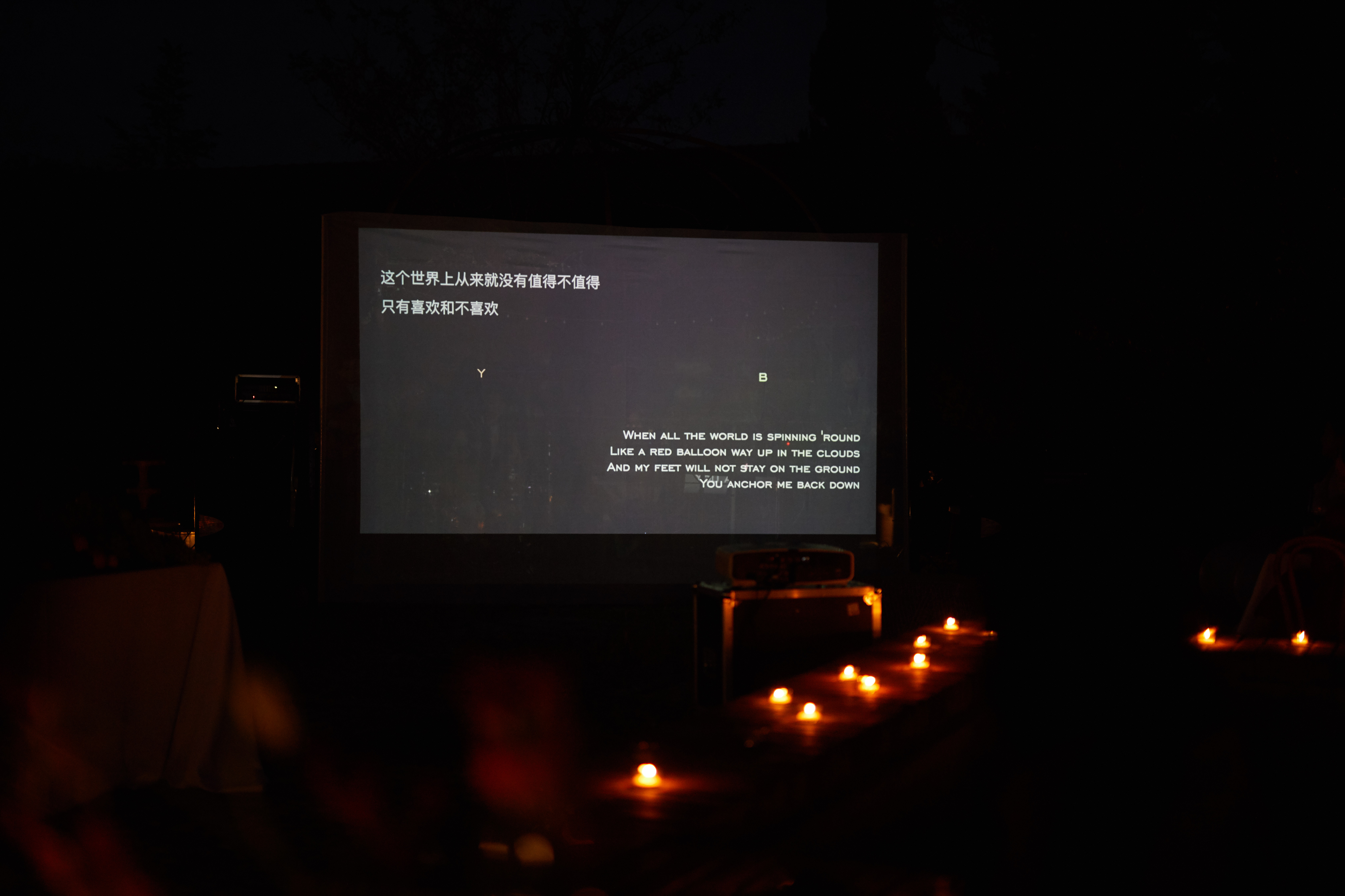 </figure>⬇️在婚礼上,我们做了一个小小的演出,通过“声音剧场”的形式,用live band跟视频讲述我们小小的爱情故事。这是其中的一桢,就让它来做本期播客的封面吧: