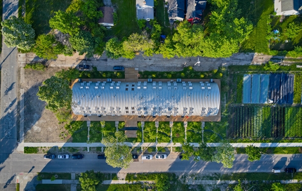 From an overhead view, we see the arched steel Quonset structure is fitted with custom dormers that introduce daylight into the interior while preserving the building's original industrial form.
