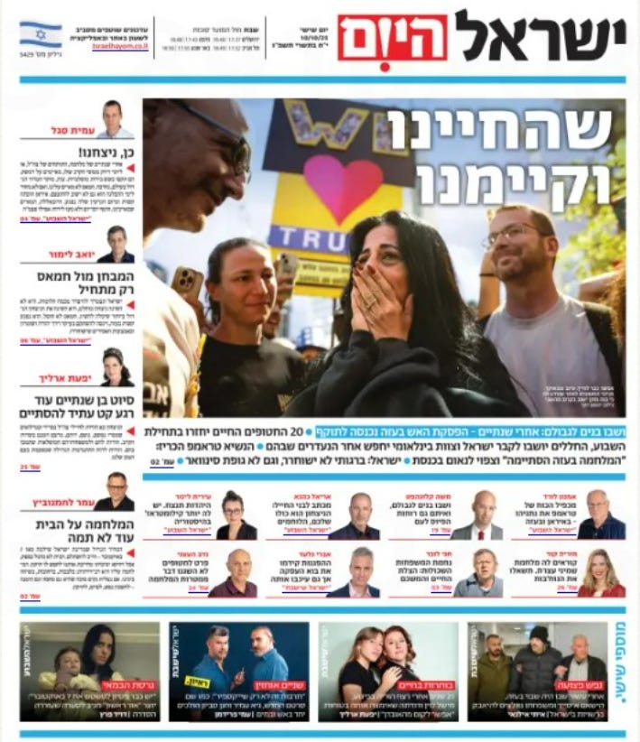 Israel Hayom: in the white headline, “Shehechyahu Ve-kiy’manu”, atop of photo of Einav Zangauker, one of the most high profile (and truly heroic) leaders of the Hostage Family Forum, upon hearing that her son, Matan, is coming home.