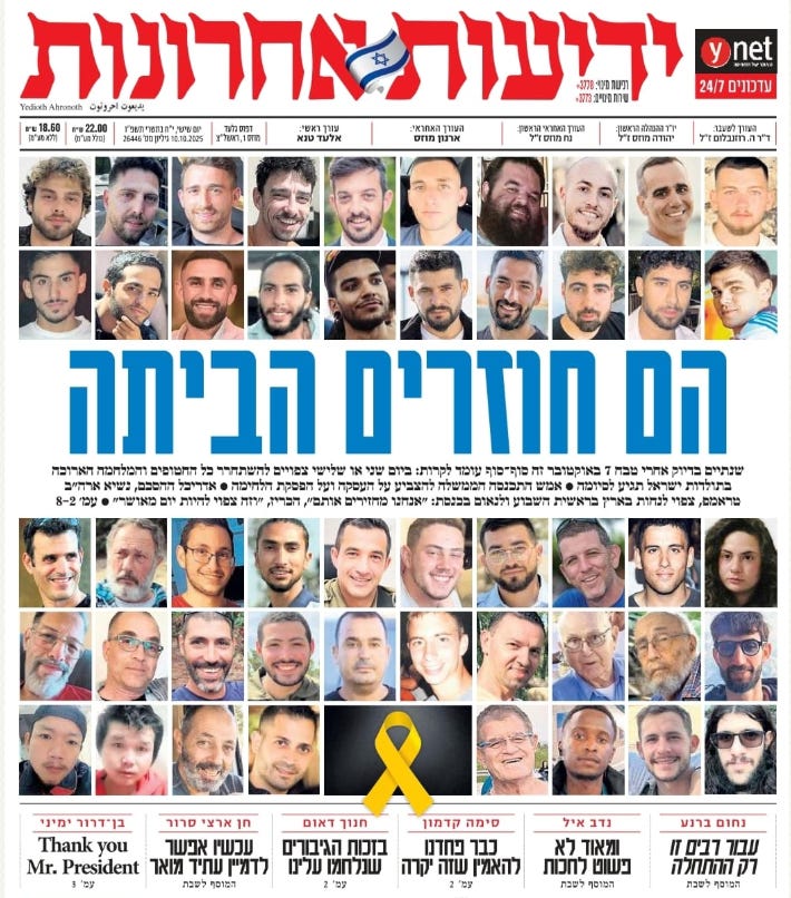 Yedi’ot Achronot: the large blue headline reads, THEY’RE COMING HOME