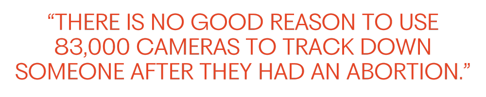This was never about “safety.” Johnson County Sheriff Adam King told reporters, “Her family was worried that she was going to bleed to death, and we were trying to find her to get her to a hospital.” But an incident report and affidavit show the case was a “death investigation” for a “non-viable fetus.” The abortion had also taken place two weeks earlier, making it unlikely they were concerned about her immediate health or safety. (As Elizabeth Ling, Associate Director of Legal Services at If/When/How told us, “There is no good reason to use 83,000 cameras to track down someone after they had an abortion.”)