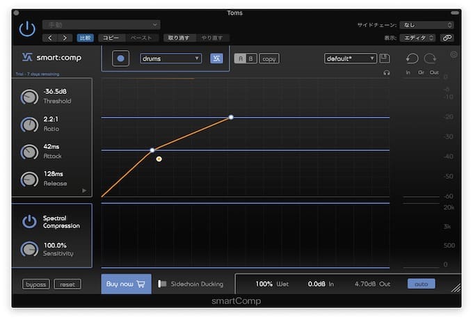 さてそのようにしてドラムトラックのKickとSnareとTomにsmart:compをかけてみました。