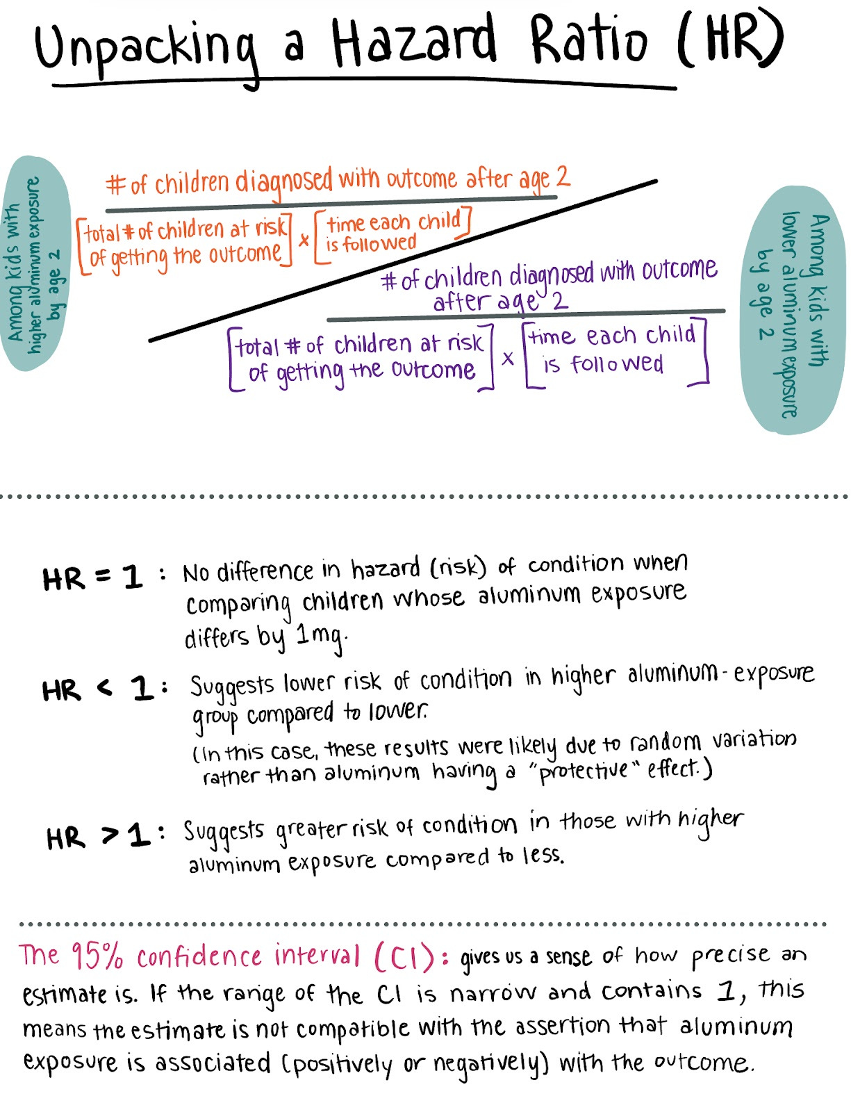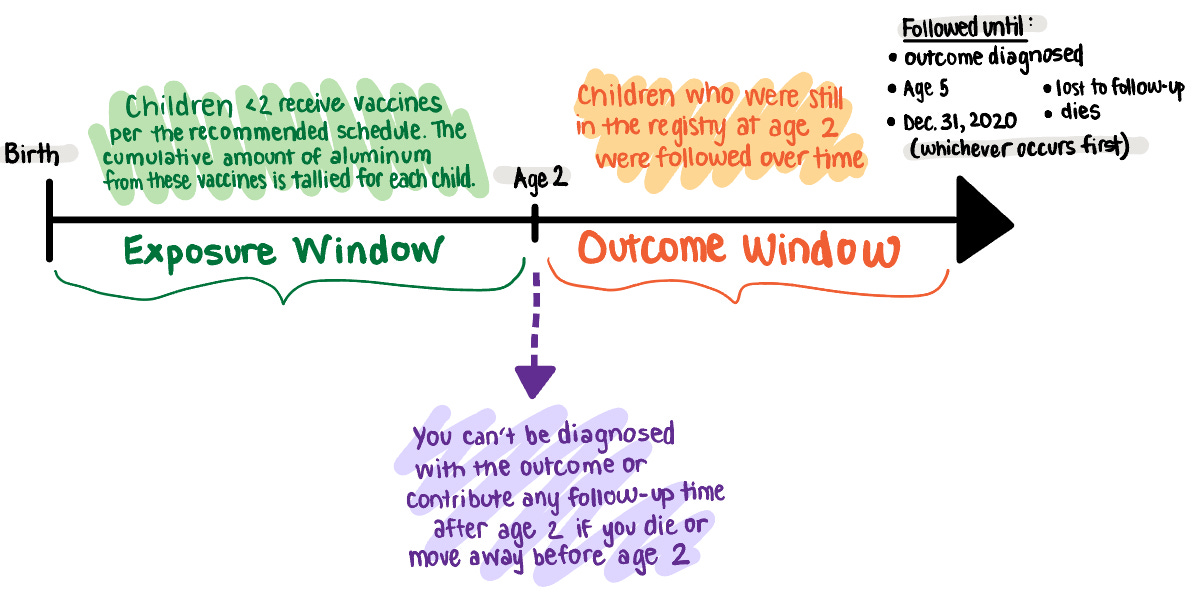 Excluding early deaths and kids diagnosed before 2 years of age: The researchers were specifically interested in new diagnoses of outcomes after 2 years of age, so they could avoid any shorter-term health differences in children under the age of 2. Children who already had one of the outcomes of interest or died before age 2, by definition, cannot receive a new diagnosis of the outcome after age 2. Starting follow-up at age 2 ensured the total level of exposure to aluminum by age 2 was set and allowed for the expected delay between symptom onset and diagnosis of these outcomes. In a secondary analysis, the authors assessed follow-up starting at 14 months and found similar results.