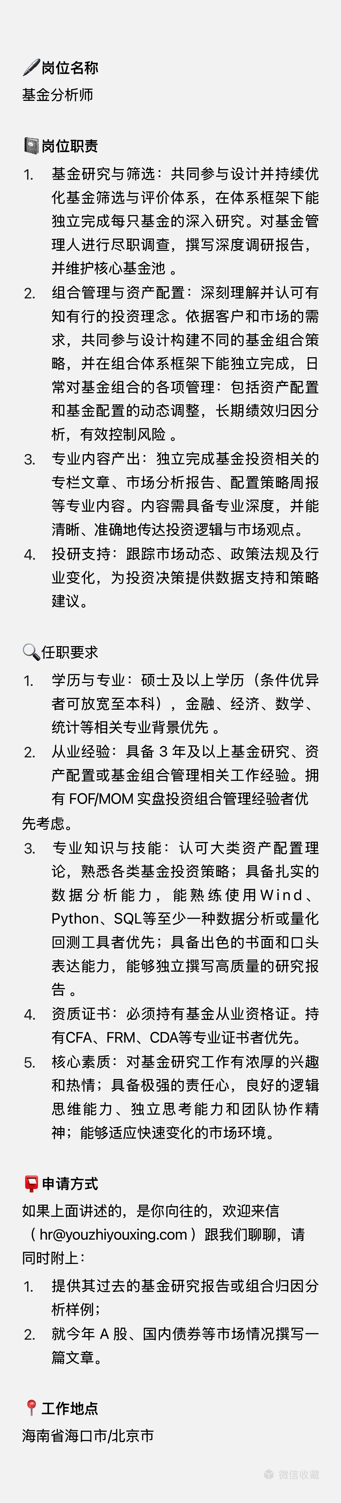 *如申请「基金分析师」岗位,请随信附上 1)提供过去的基金研究报告或组合归因分析样例;2)就今年 A 股、国内债券等市场情况撰写一篇文章。