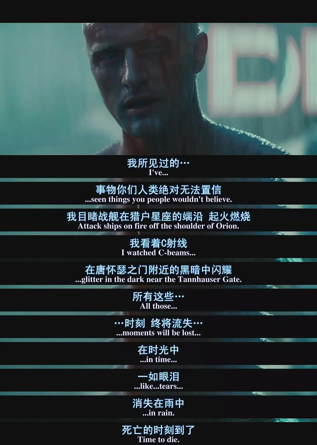 85:00 电影:《银翼杀手》,改编自菲利普·迪克的小说《仿生人会梦见电子羊吗?》 ,片中仿生人死前独白如下——