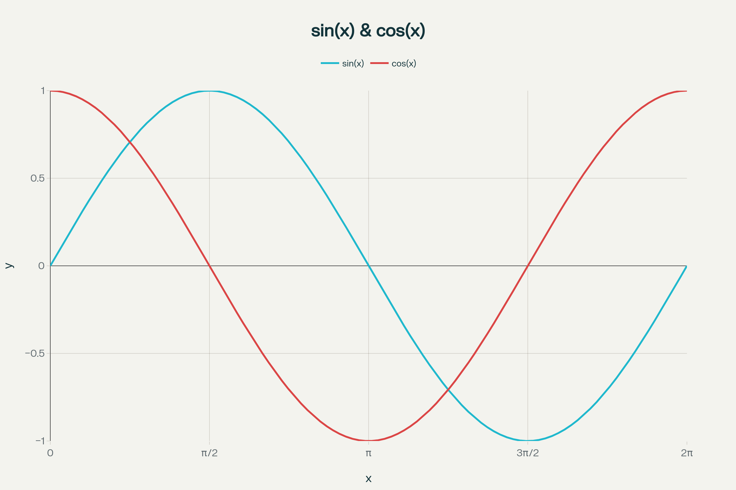 54:24 正弦波/余弦波:一种周期性上下波动的数学曲线,两者波形本质一样,唯一差别是相位差 90 度(π/2)。一个达到峰值的同时,另一个正好通过零点。