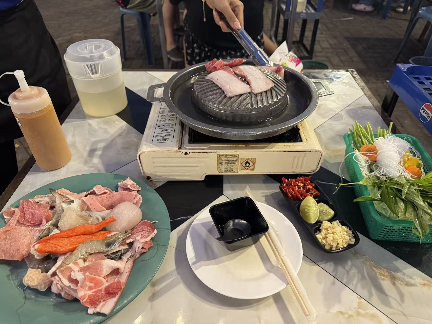 26:37 万象河边“Mookata”(Soup BBQ):类似泰国烤肉火锅,中间铁板烤肉,四周环槽煮食材