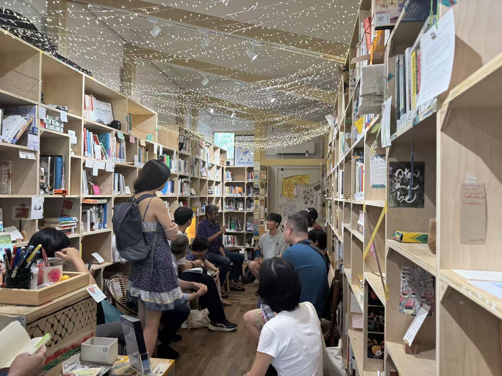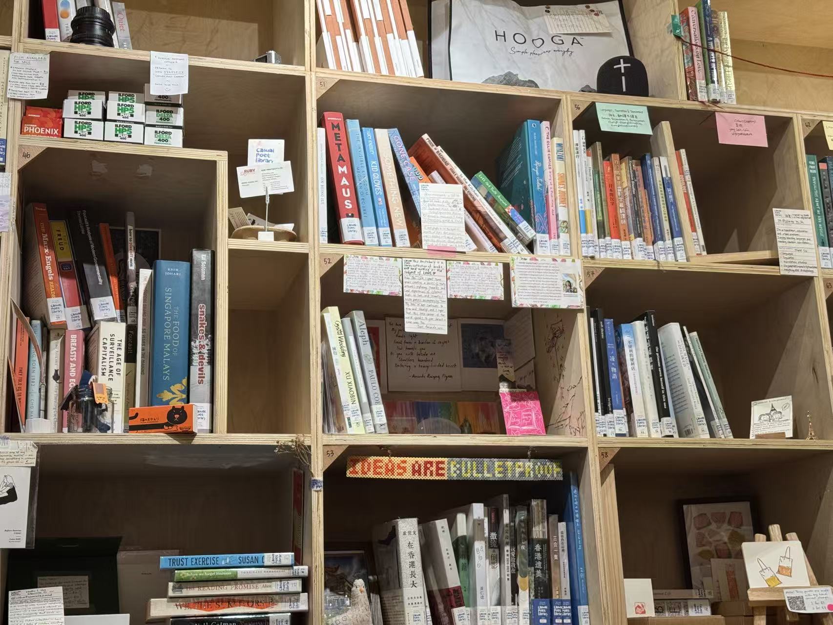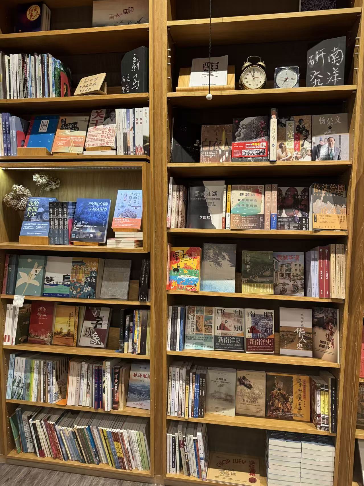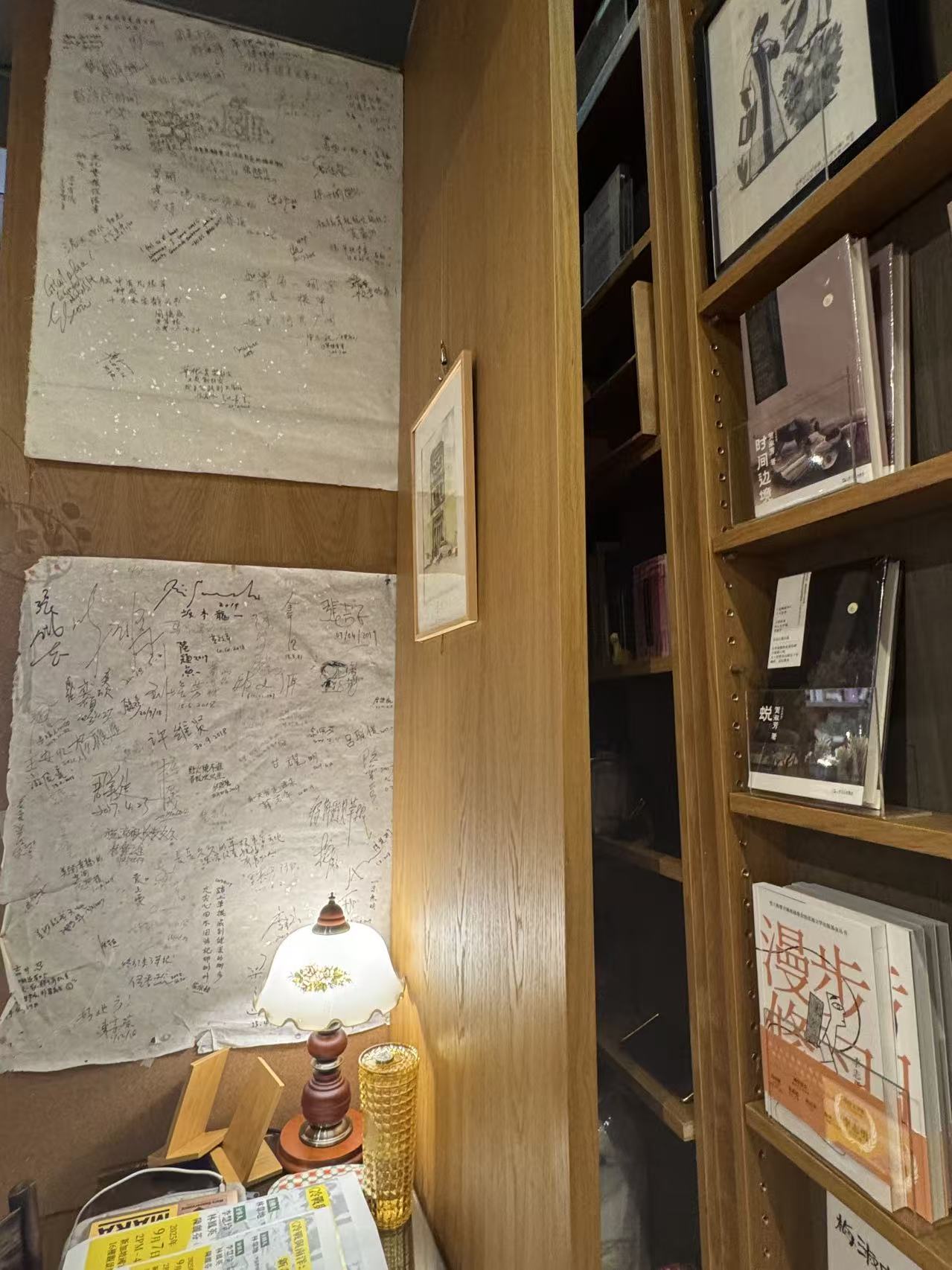 10:53 有马华文学、南洋研究主题书架;还有一面墙上贴着梁文道、王安忆、坂本龙一等人的名人签名