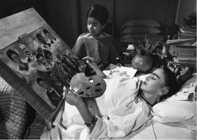 </figure>在床上绘画的弗里达