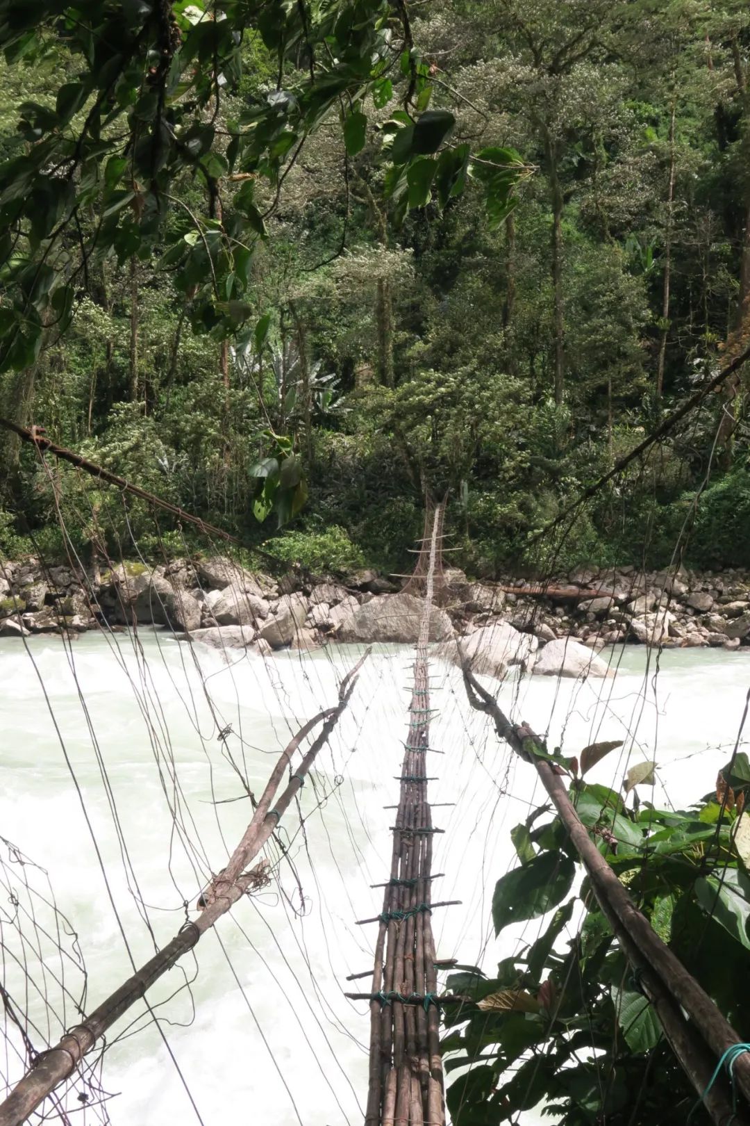 ▲独龙江藤篾桥:用山上的竹子和藤条编织而成,一般建在江面狭窄、水流湍急的地方。人走在桥上,桥就像飞起来一样,独龙族把它叫作“会飞的桥”。