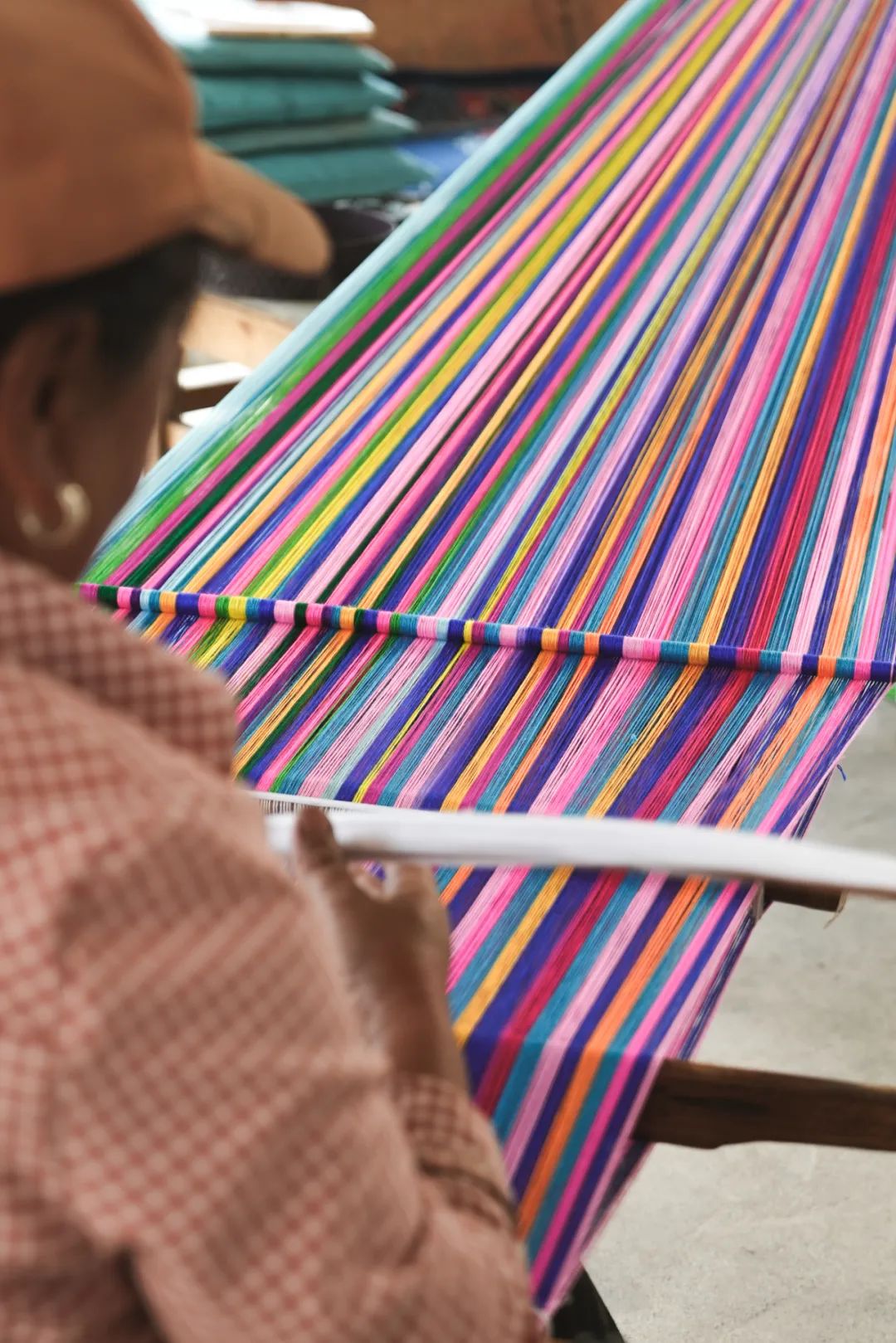 ▲怒毯:怒毯和独龙毯编织方式相似,纺织怒毯通常以红、白、黄、蓝、绿、青、紫为主要色彩,色彩斑斓犹如一道流动的彩虹,被称作“彩虹毯”。