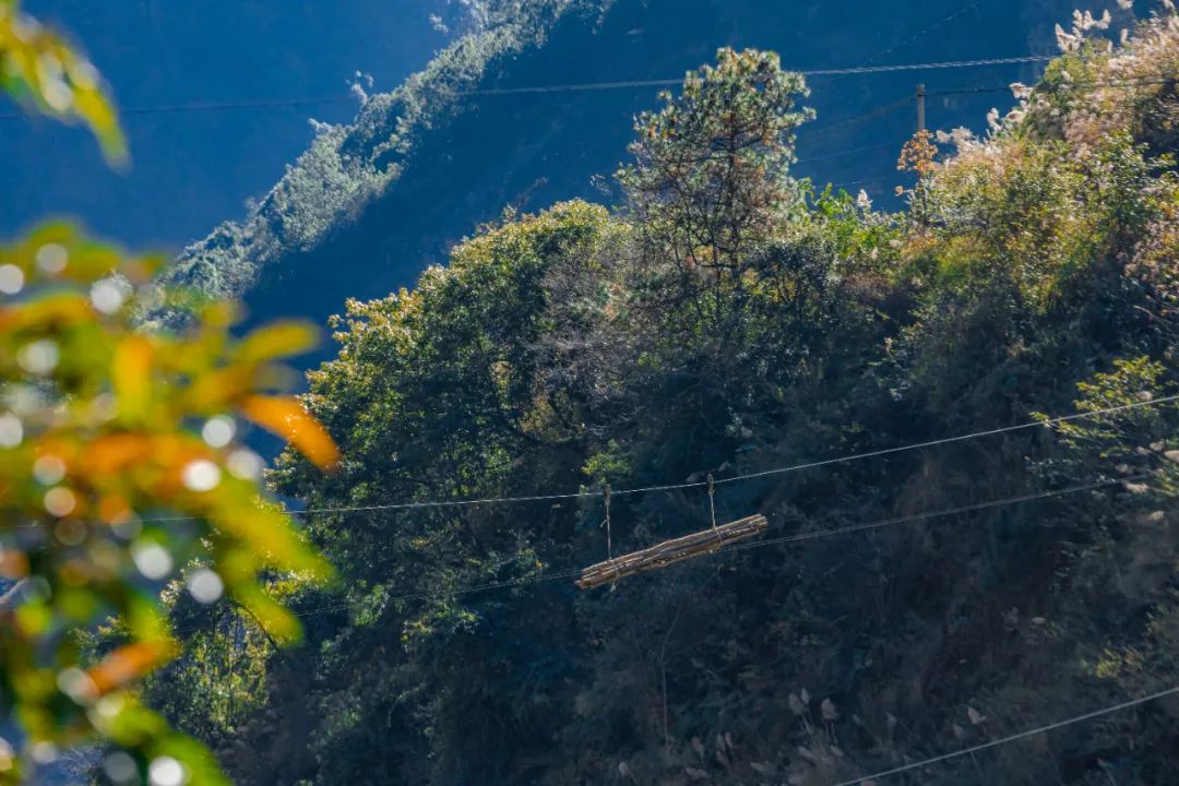 ▲怒江溜索:溜索主要有两种形式——平溜和陡溜。平溜的溜索两头一样高,来往都可过,但溜到江心后得双臂用劲,攀到对岸。陡溜有一定的倾斜度,可自然滑向对岸,十分轻快。陡溜一般都是两根,倾斜方向相反,来回省力。