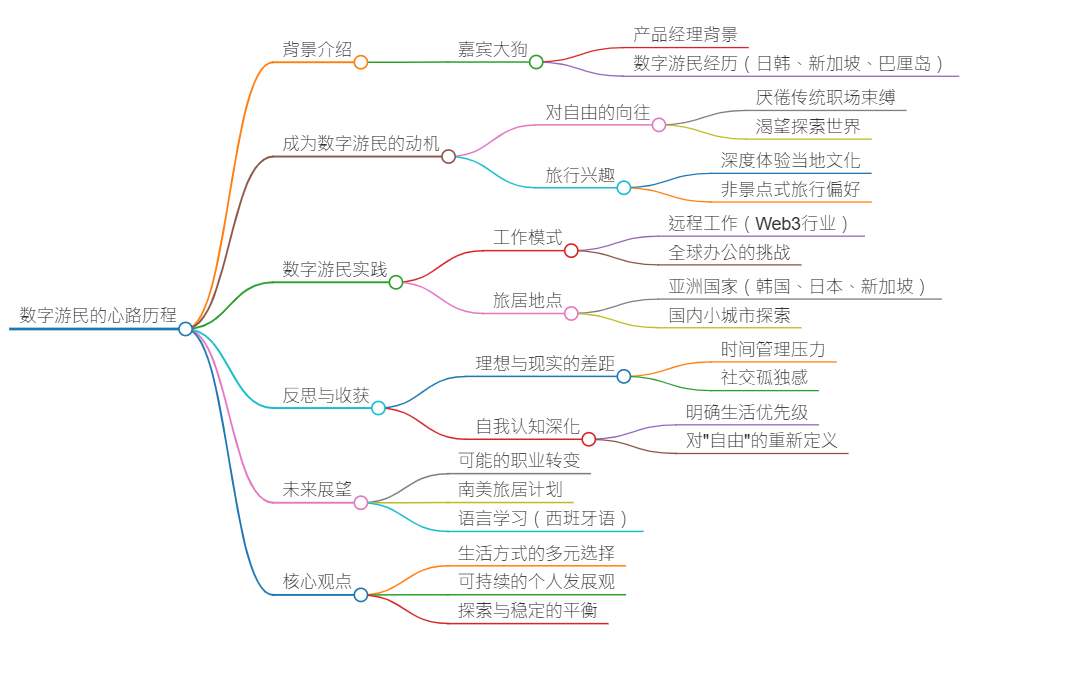 - 数字游民的初衷:大狗厌倦了传统职场的束缚,向往自由探索世界的生活方式,受博主和纪录片启发开始尝试数字游民。