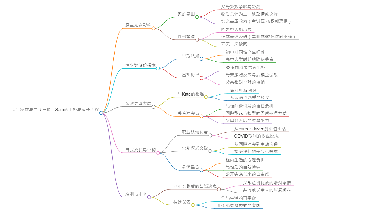 - Sam从小在传统家庭长大,父母关系紧张,塑造了她回避型人格和情感表达障碍