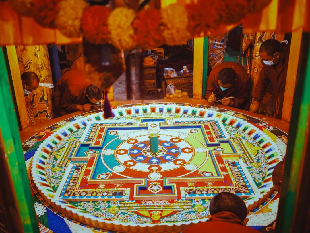 ▲田妥寺僧人正在制作精美的沙画坛城,当坛城完成后,僧人们会在庄严的诵经声中,合沙拂去坛城,象征“诸行无常”。