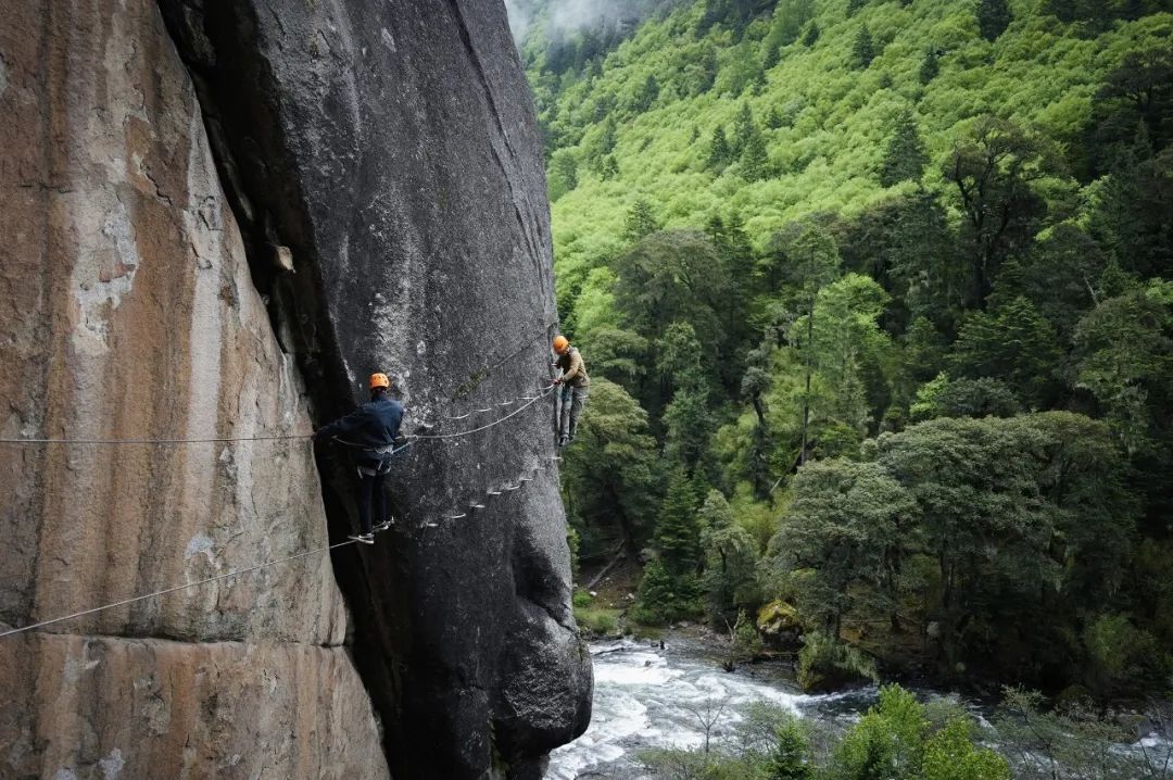 ▲松赞百巴飞拉达体验:像岩羊一样扒在岩壁上,感受岩石的温度和肌理,聆听森林与溪流的声响。
