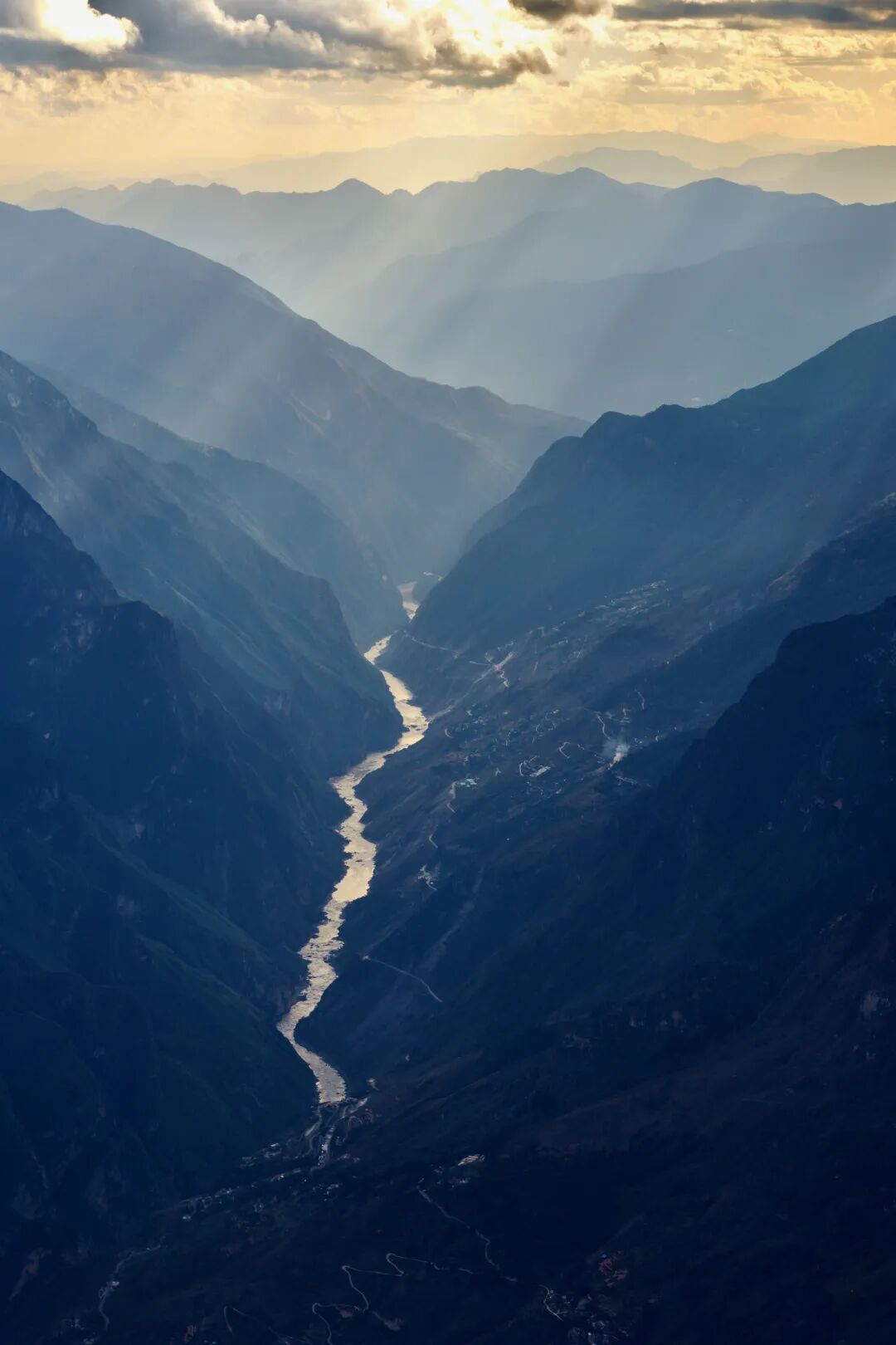 ▲夕阳下的虎跳峡,金沙江切开哈巴雪山和玉龙雪山。