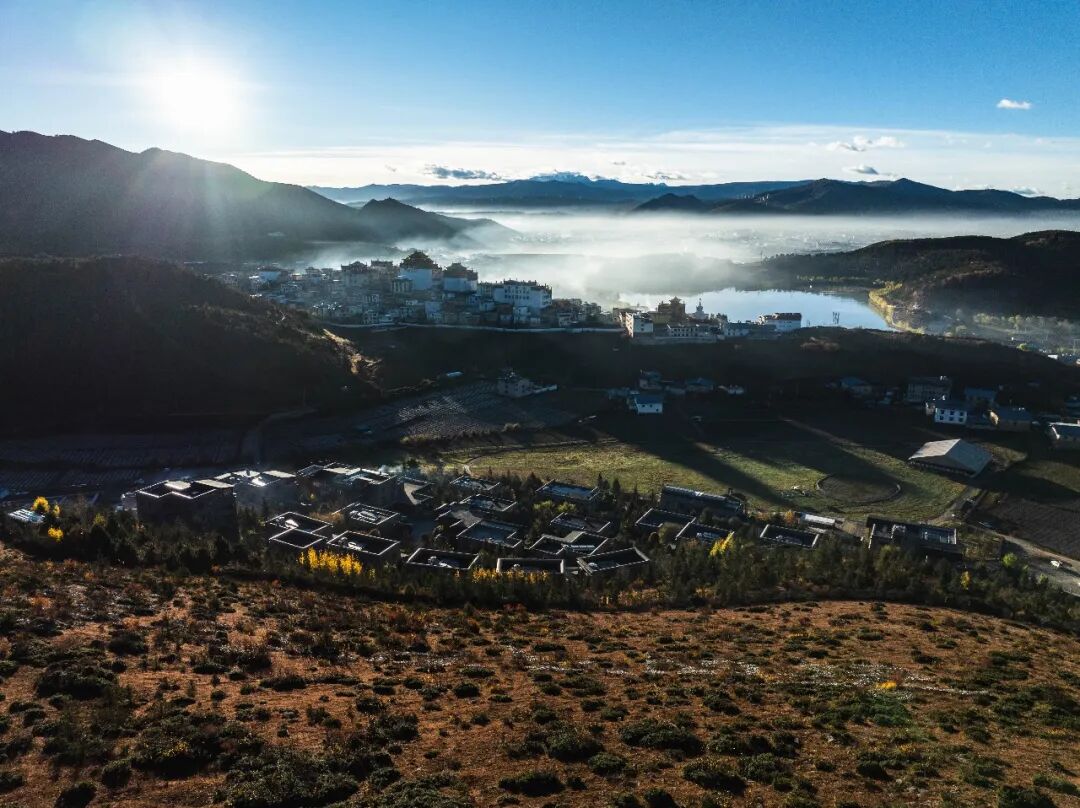 ▲清晨桑烟袅袅,航拍松赞香格里拉林卡、拉姆央措湖和松赞林寺。