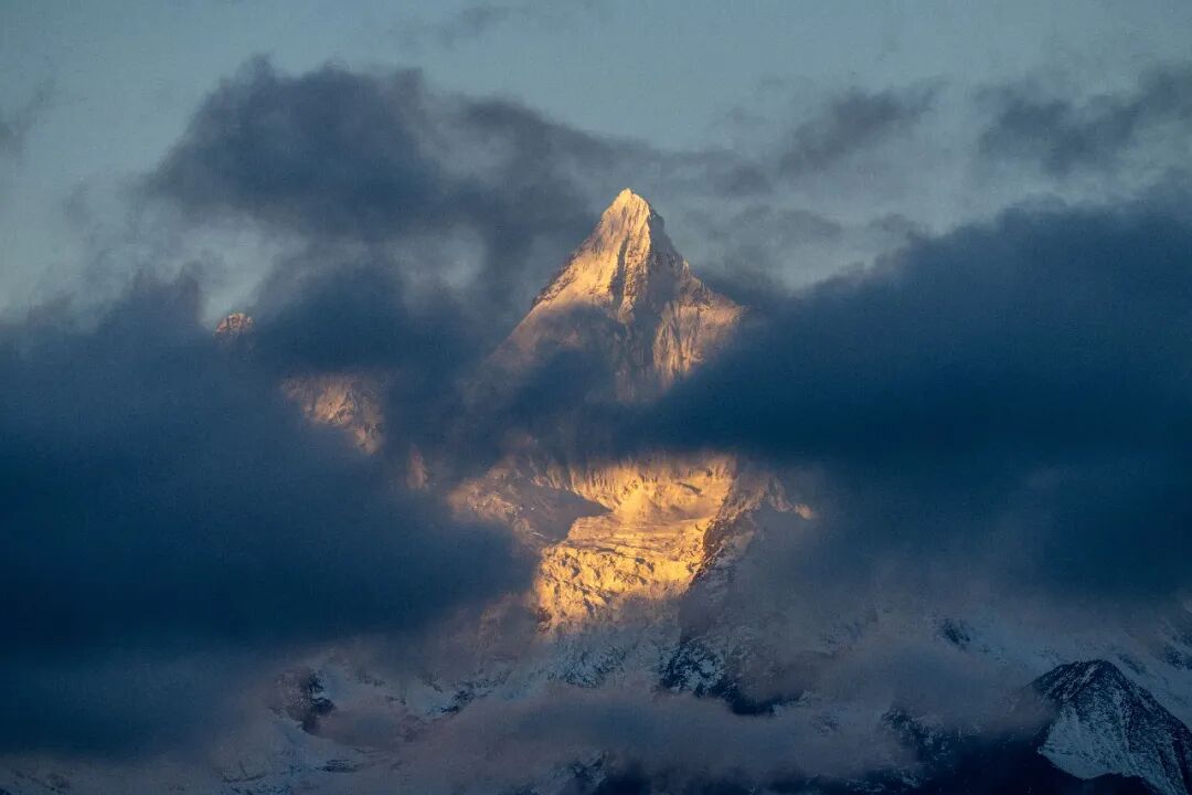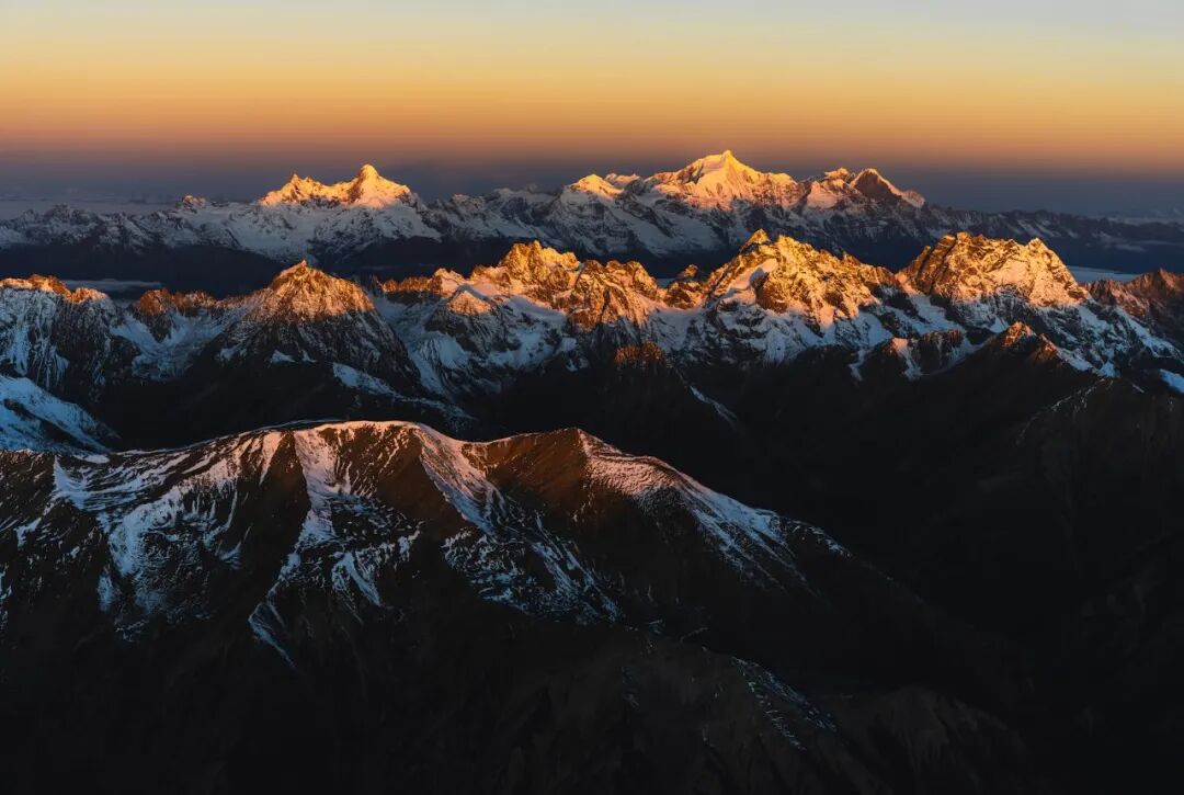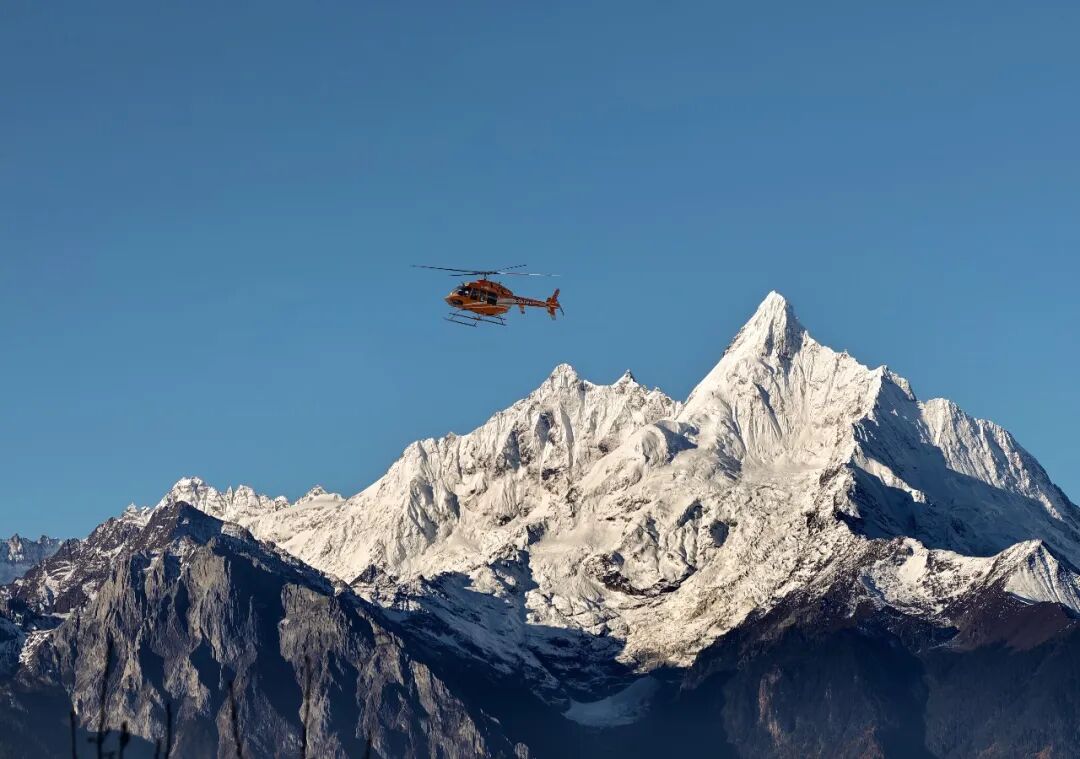 ▲日照金山是梅里雪山最动人的时刻。在地面仅可见梅里一山金辉,而乘直升机飞至白马雪山东侧,则可同时观赏到梅里雪山和白马雪山同框下的日照金山,甚至还能看到周边碧罗雪山的日照奇观。