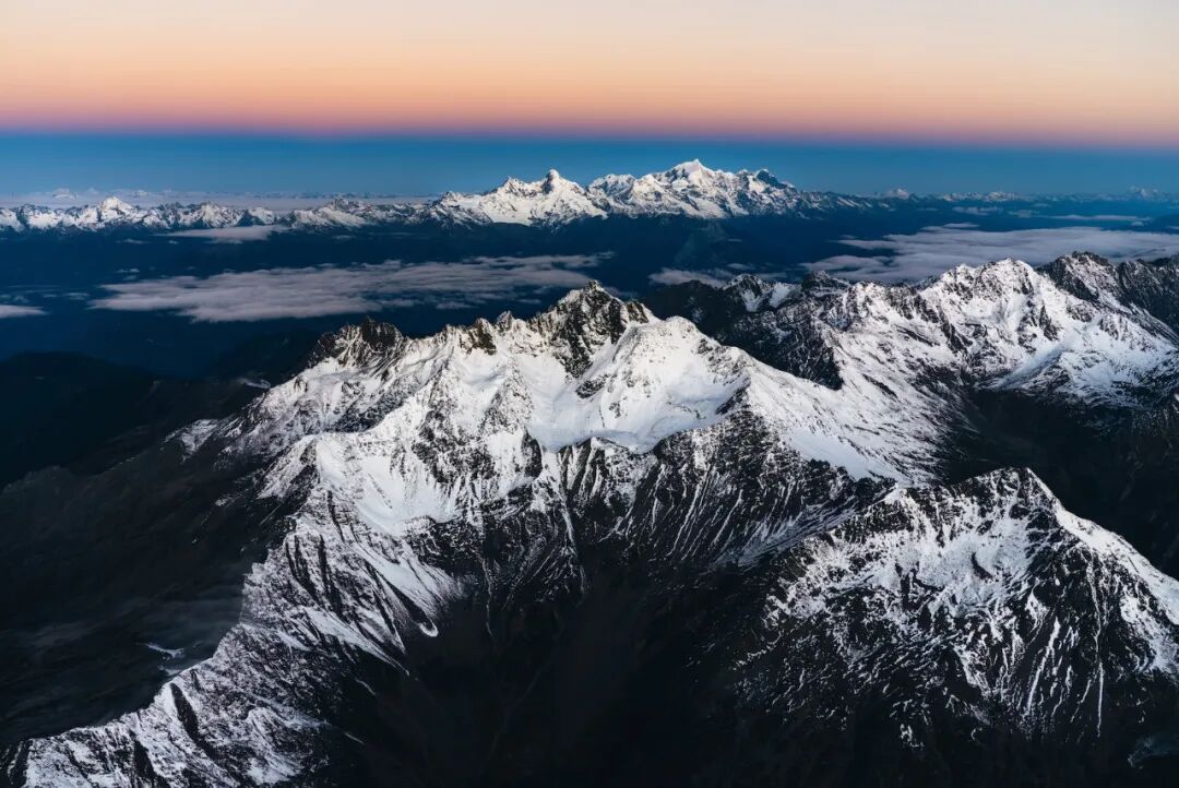 ▲清晨日出前,从直升机上眺望梅里雪山迷人的蓝调时刻与维纳斯带。