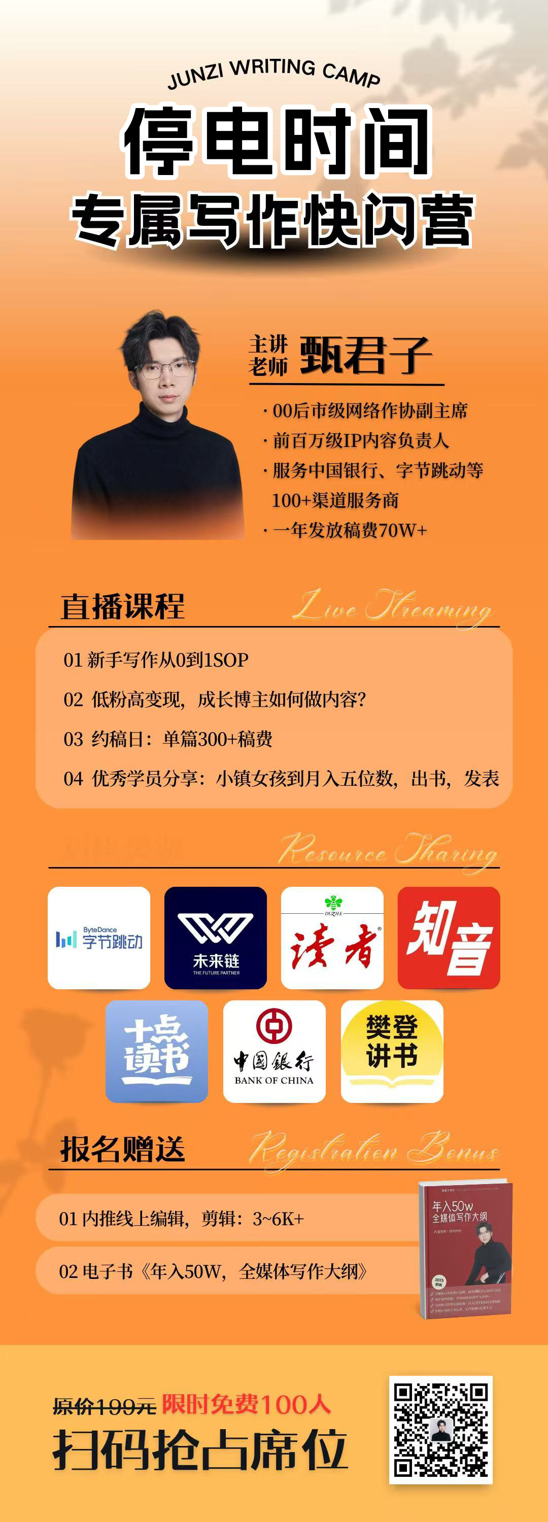 在我极力争取下,君子为停电时间的小电池送出——凝结了他7年自媒体心法的6w字干货资料《从0-50w,全媒体大纲》以及100个由他亲自带教免费的5天直播训练营名额,先到先得!