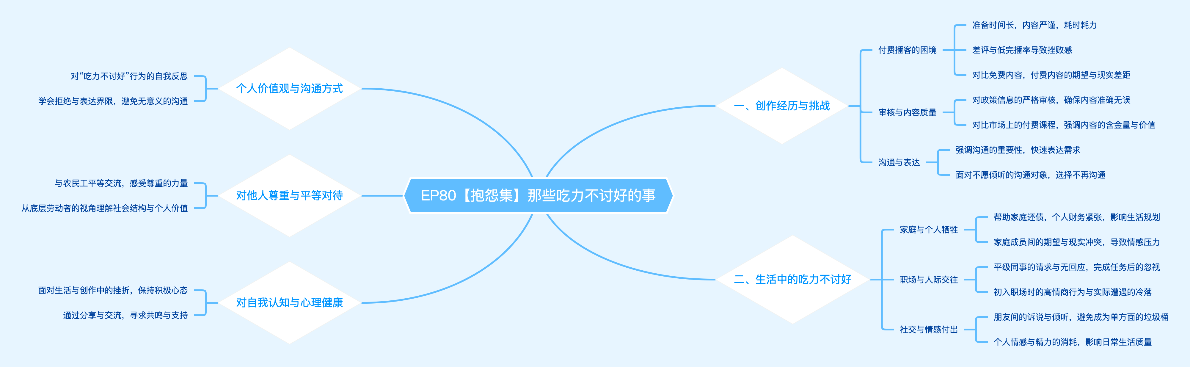在上期播客制作过程中,遇到了审核未通过的挑战,这促使我们深入探讨了“吃力不讨好”的现象,通过个人经历分析了家庭、职场及友谊中的种种复杂关系。不仅讨论了现代社会中人际关系的微妙,还触及了个人成长与自我认知的重要性,强调了有效沟通在维持良好社会关系中的关键作用。我们同时反思了在付出情感与精力后仍需保持关系的策略,展现了对生活细节的深刻洞察和对人际关系复杂性的独到见解。