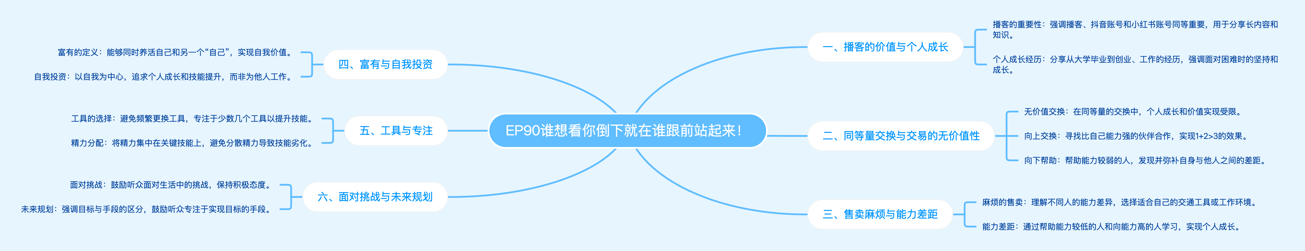 本次博客贝拉分享了对个人成长、播客制作以及实现目标的见解。通过自己的创业、职场和生活经历,分享了个人成长的重要性,提倡通过不断学习和努力,实现真正的进步,反对只维持在舒适区,而要通过“让上看到你”的策略,让有资源和影响力的人看到你的价值和潜力。强调了聚焦于自己的成长和自我提升的重要性,鼓励听众勇敢面对挑战,设定清晰的目标,并通过不断努力和学习来实现个人成长和成功,真正的挑战在于如何定义自己的价值和成功标准,以及如何采取行动来实现这些目标。