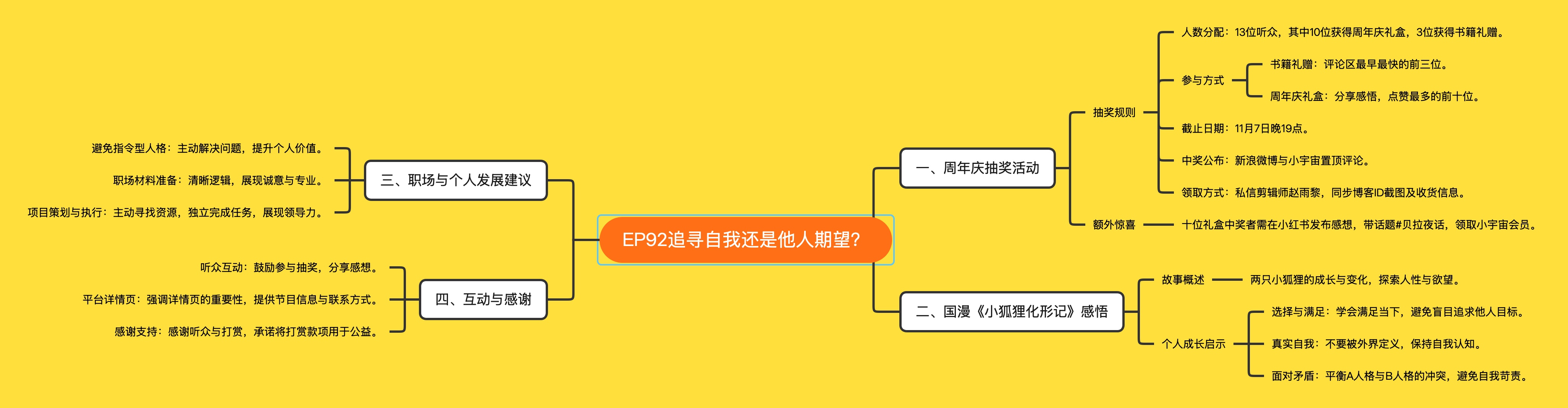 本期播客,强调首先提出结论的重要性,并详细阐述了逻辑分析、方案对比以及突出重点的方法。他们还结合个人职场经验,提供了找到理想工作、提升效率和避免成为“指令型人格”的建议,强调找到感兴趣的行业并视自己为产品进行自我提升的重要性。此外,主讲人强调批判性思维在职场分析中的价值,并以轻松的语气鼓励听众根据自己的判断行动。播客还涉及了国漫《小狐狸化形记》的故事,探讨了成长、选择与自我认知的主题,鼓励听众深入思考自己的选择和行为对人生路径的影响。同时,预告了即将到来的周年庆抽奖活动,希望大家踊跃参与❤️