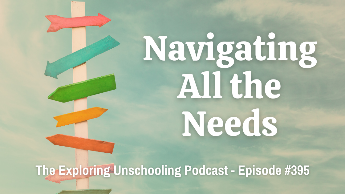 </figure>In this episode of Exploring Unschooling, Pam, Anna, and Erika talk about navigating all the needs in our unschooling families. Navigating all the needs can be one of the biggest puzzles of parenthood. In many cases, we’re going from only being responsible for ourselves, to then being in partnership with someone else, to then adding children one by one. And as the children are growing, they each have their own ideas and their own personalities and their own needs. And so, the number of needs that exist in our family at any given time is just increasing as we have more children.