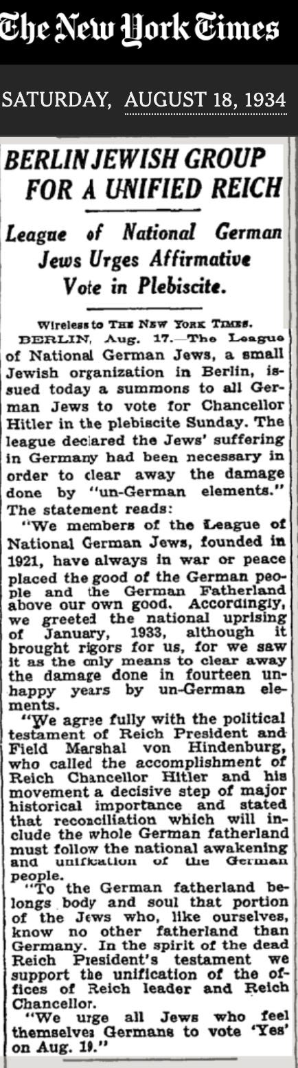 Last week, on the subject of the New York City elections, I shared (without comment) an article from the New York Times in 1934 about a group of German Jews who voted for Hitler (I am not in any way comparing Mamdani to Hitler, obviously). Many readers were rather stunned by the NYT article, but one, a historian, kindly wrote me to share a bit of followup to that story, of which I was not aware. I’m very grateful to my friend, the talented author, Professor Rick Richman for having taught me this little bit of history.