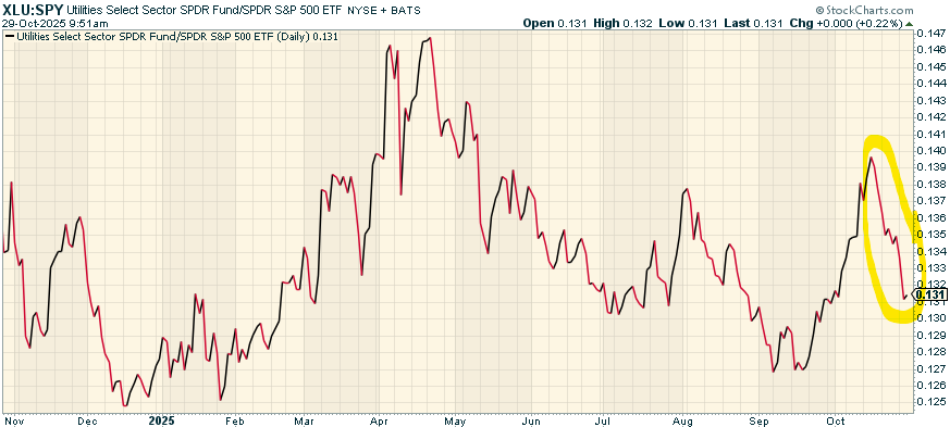 The logic is straightforward: utilities are safe-haven assets. When fear dominates, investors flock to them; when confidence returns, they sell them. The recent steep drop in utilities relative to the S&P 500—one of the weakest in years—implies investors are comfortable shifting into cyclical and growth stocks. If traders truly sensed danger, they’d be hiding in utilities, not abandoning them.