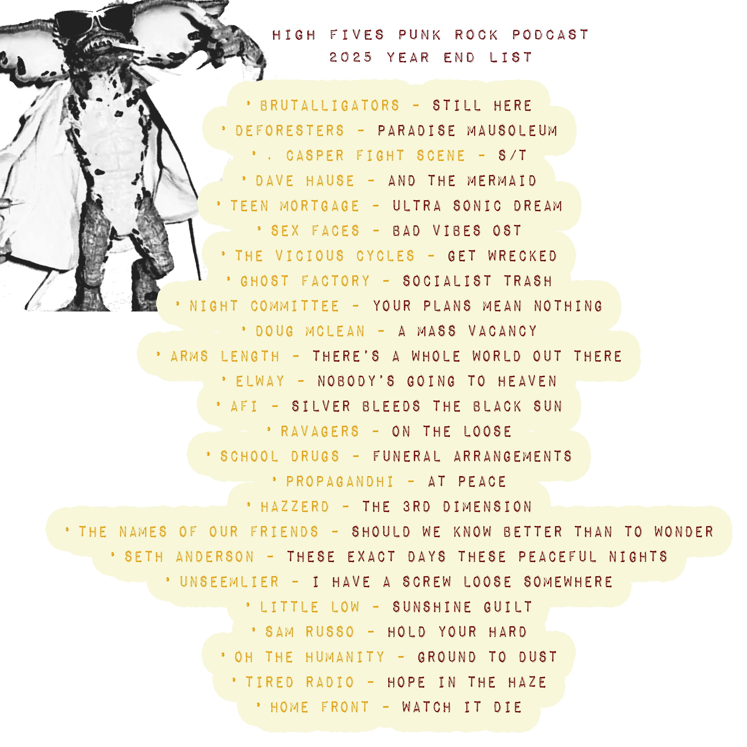 It’s our annual year-end blowout episode! Mike breaks down some of his favorite punk rock, emo, pop punk, hardcore, Midwest emo, melodic punk albums from the past year. This one’s a doozy — packed with guest picks, special guest appearances, and a ton of music for you to listen to, discover, and hopefully fall in love with. Featuring discussions and music from bands like: Brutalligators, Deforesters,Casper Fight Scene, Dave Hause And The Mermaid,Teen Mortgage – Ultra sonic Dream,Sex Faces – Bad Vibes OST,The Vicious Cycles – Get Wrecked, Spiritual Cramp,The Hives, Ghost Factory – Socialist Trash, Night Committee – Your Plans Mean Nothing, Final Boss Fight, Coheed and Cambria, Creeper, Doug McLean , Arms Length ,Home Front, Tired Radio,Hot Mulligan,Elway ,Ravagers,AFI,School Drugs,Propagandhi ,Hazzerd,The Names of Our Friends,Seth Anderson,Unseemlier,Oh The Humanity,Sam Russo,Little Low, Mike Koop, JSM, Chixdiggit, Sketchy Records, Ways Away,