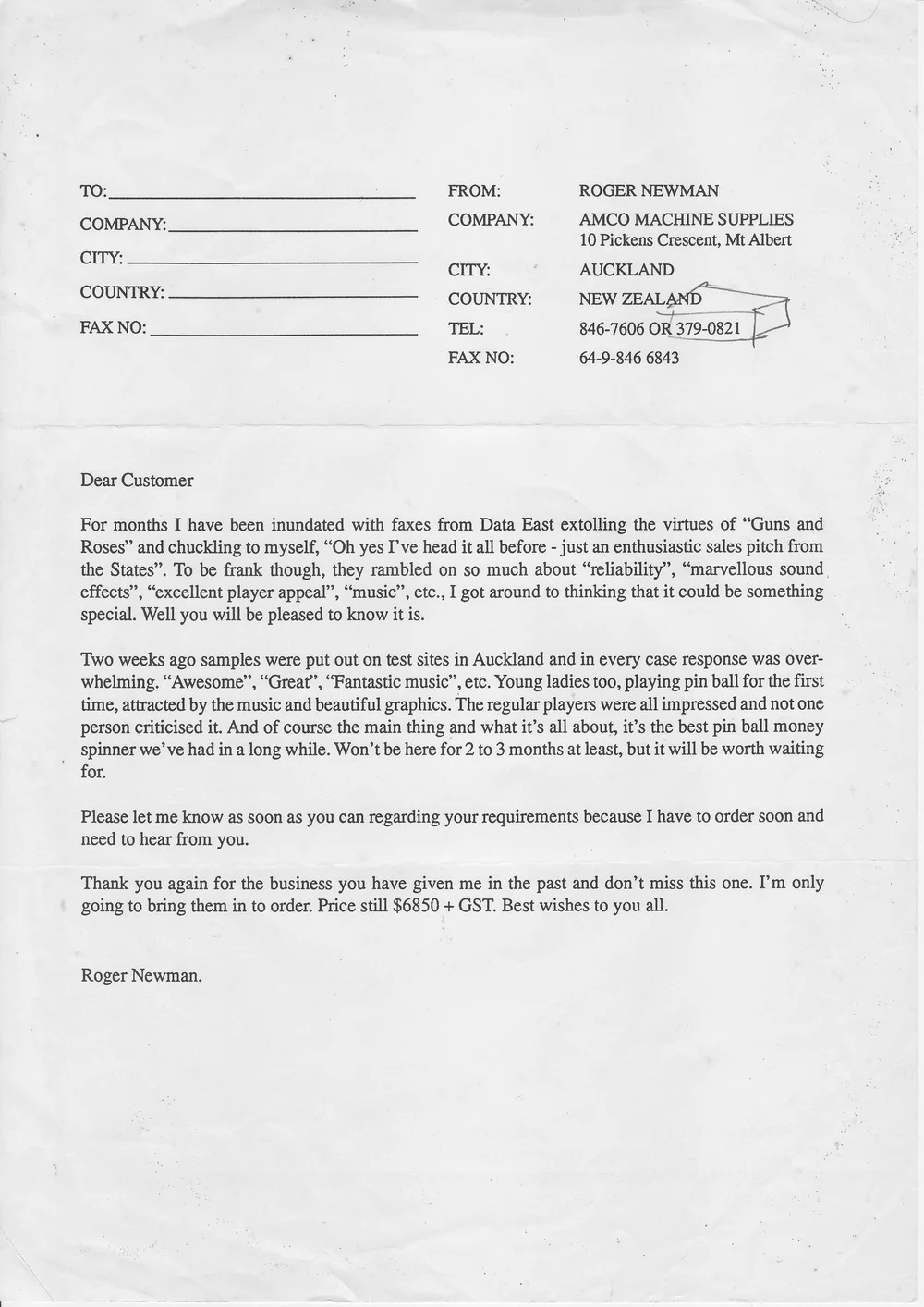 Below is a letter that Roger sent out to operators, praising the virtues of the then new Data East Gun’s n Roses machine. It is endearing for it’s content.
