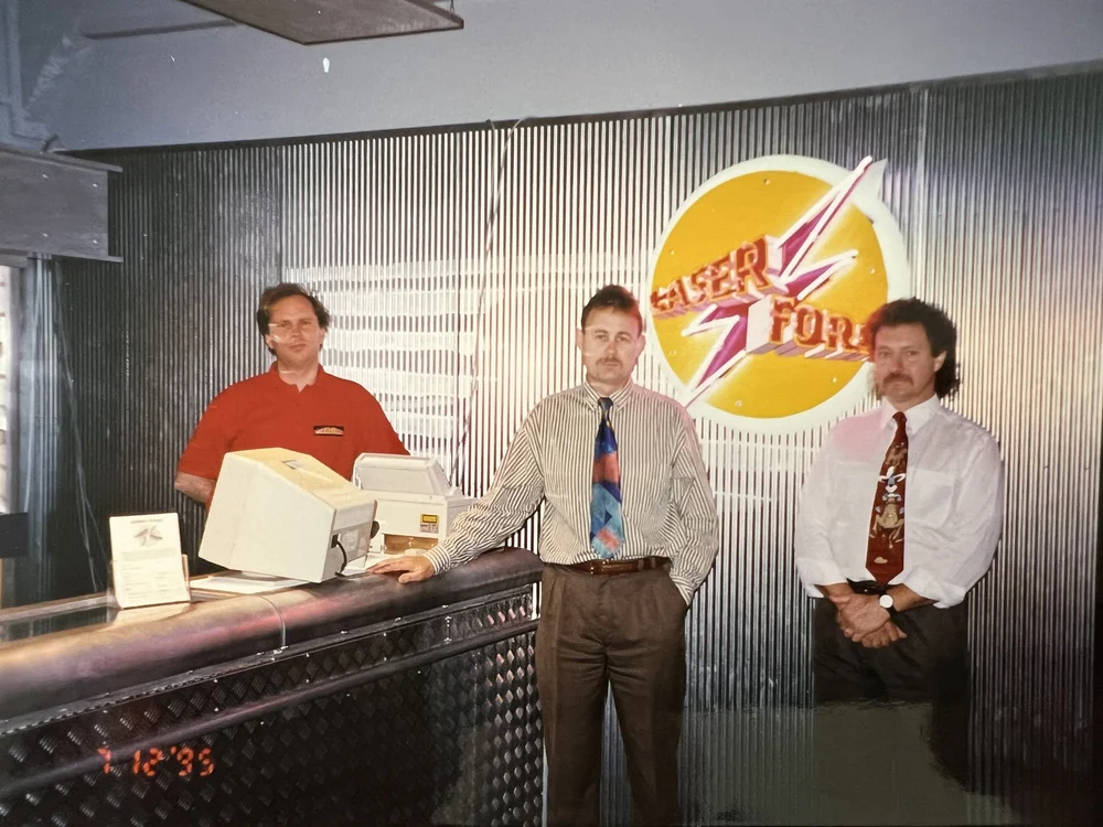 Mike (centre) at the “Laser Force” maze-bazed laser tag at a Courtenay Place, Wellington arcade in 1995