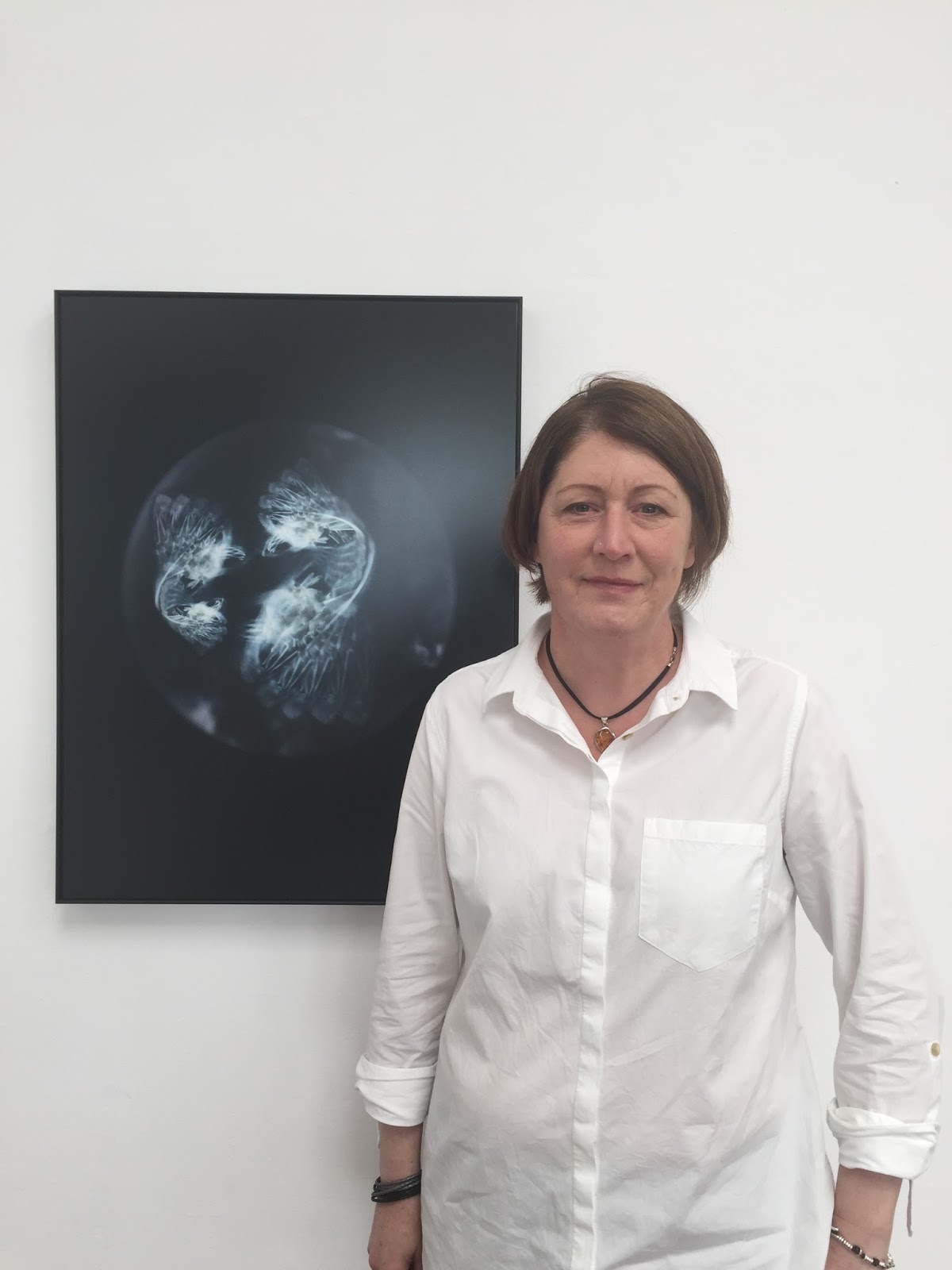 | Mandy Barker with of her photographs on display at the Sirius Arts Centre, Cobh, Ireland, 27th May, 2017 |