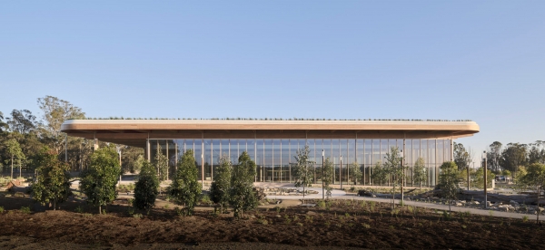 The ground floor is nearly 90% glass, allowing visitors to see into the advanced manufacturing hall and reinforcing the building's mission of openness and collaboration.