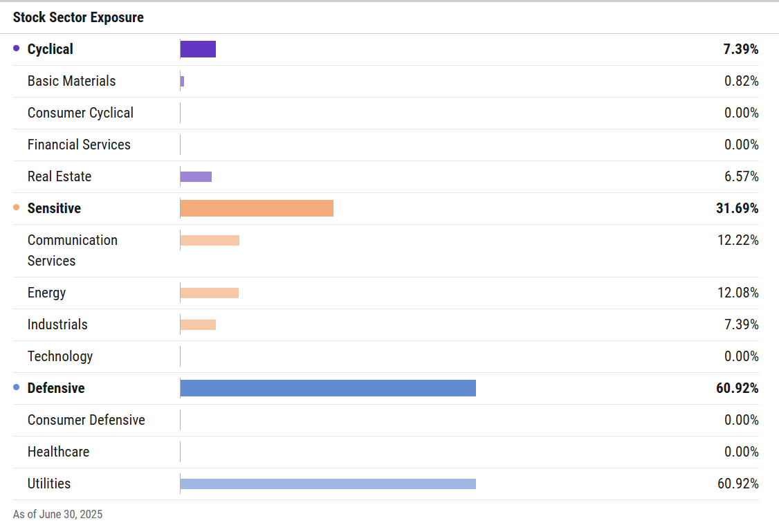 The Reaves Utility Income Fund (UTG), launched in 2004, seeks high after-tax income and total return through investments in utility-related equities. The fund primarily holds dividend-paying common stocks, with moderate leverage of roughly 20–25% to enhance yield. UTG may invest up to 20% of assets beyond core utilities³—covering telecoms, infrastructure, and energy pipeline companies. This flexibility broadens its scope across essential-service industries. The result is exposure to electric, gas, and water utilities alongside communications and infrastructure names—creating a diversified, income-oriented mix.