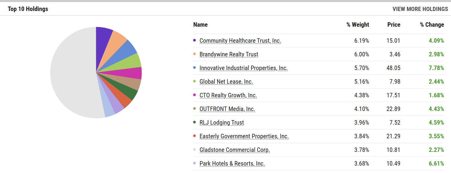 The top holdings say everything you need to know: Brandywine Realty Trust (office exposure in a world that still can’t figure out hybrid work), Innovative Industrial Properties (cannabis-linked industrial real estate with tenant risk), Community Healthcare Trust, Park Hotels & Resorts, and Global Medical REIT.⁵