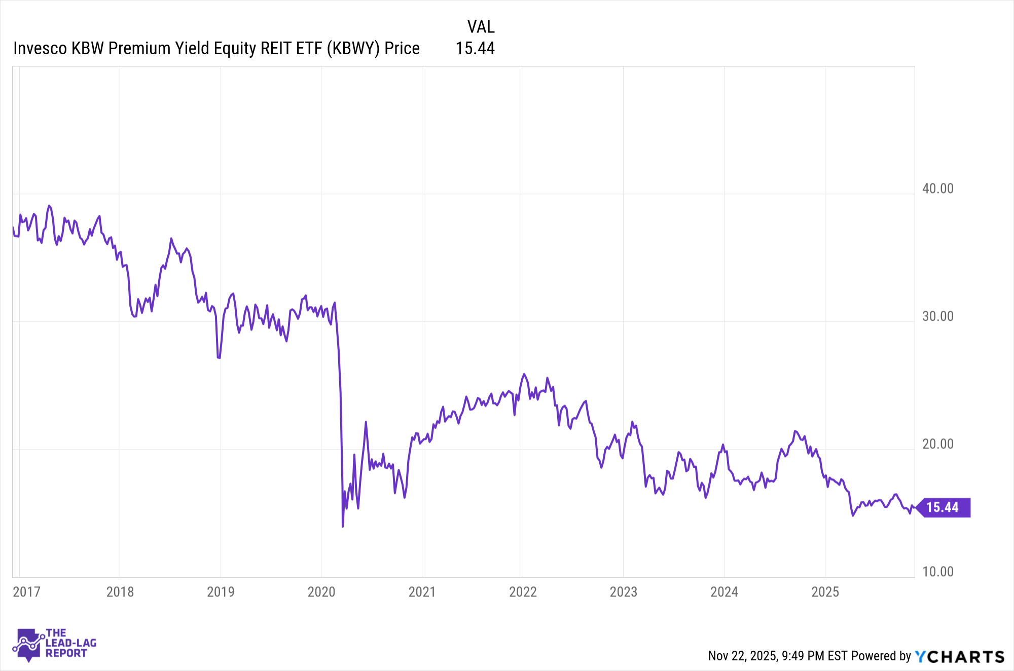 In 2020, KBWY fell -33.6%.⁹