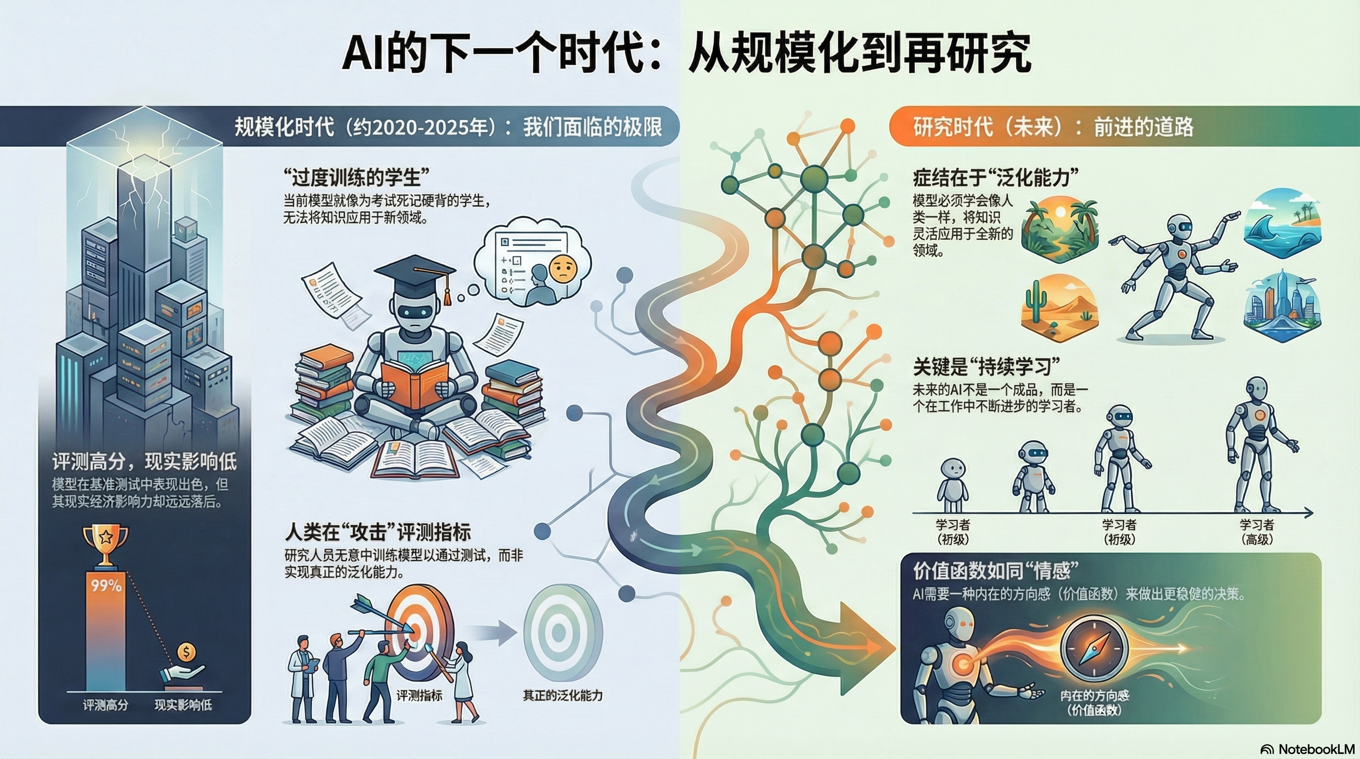 本期播客概述了关于人工智能现状与未来发展方向的深刻对话。讨论的核心在于当前 大型语言模型 (LLM) 在评估中的优异表现与其对经济影响的滞后之间存在的费解脱节,并认为随着数据的限制,单纯依靠 规模化 (scaling) 的时代正走向终结。对话重点强调需要重新回归 研究时代 (age of research),以解决模型在 泛化能力 (generalization) 和 样本效率 (sample efficiency) 方面的根本缺陷,这是目前 AI 与人类学习能力相比的不足之处。通过借鉴人类 情感 (emotions) 在进化中作为指导价值函数的作用,他们探讨了诸如 价值函数 (value functions) 和 强化学习 (RL) 等技术可能提高模型学习效率。最终,两位人士讨论了 超级智能 (superintelligence) 必然到来以及如何确保其 安全部署 (safe deployment) 的问题,呼吁所有领先公司应收敛于共同的 对齐策略 (alignment strategies),使 AI 关心所有有情生命。