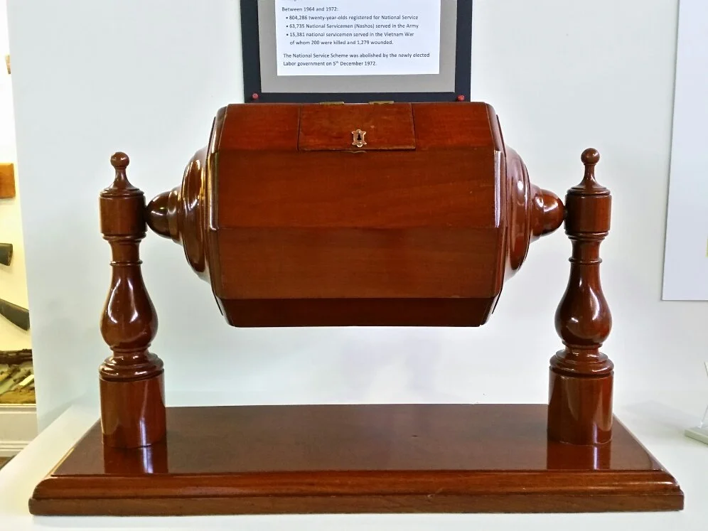 A lottery barrel used to select the birthdays of men who registered for National Service; men whose birthdays were drawn out were required to attend a medical and then, if fit, to complete military training. Photograph c/ The National Vietnam Veterans Museum, Phillip Island